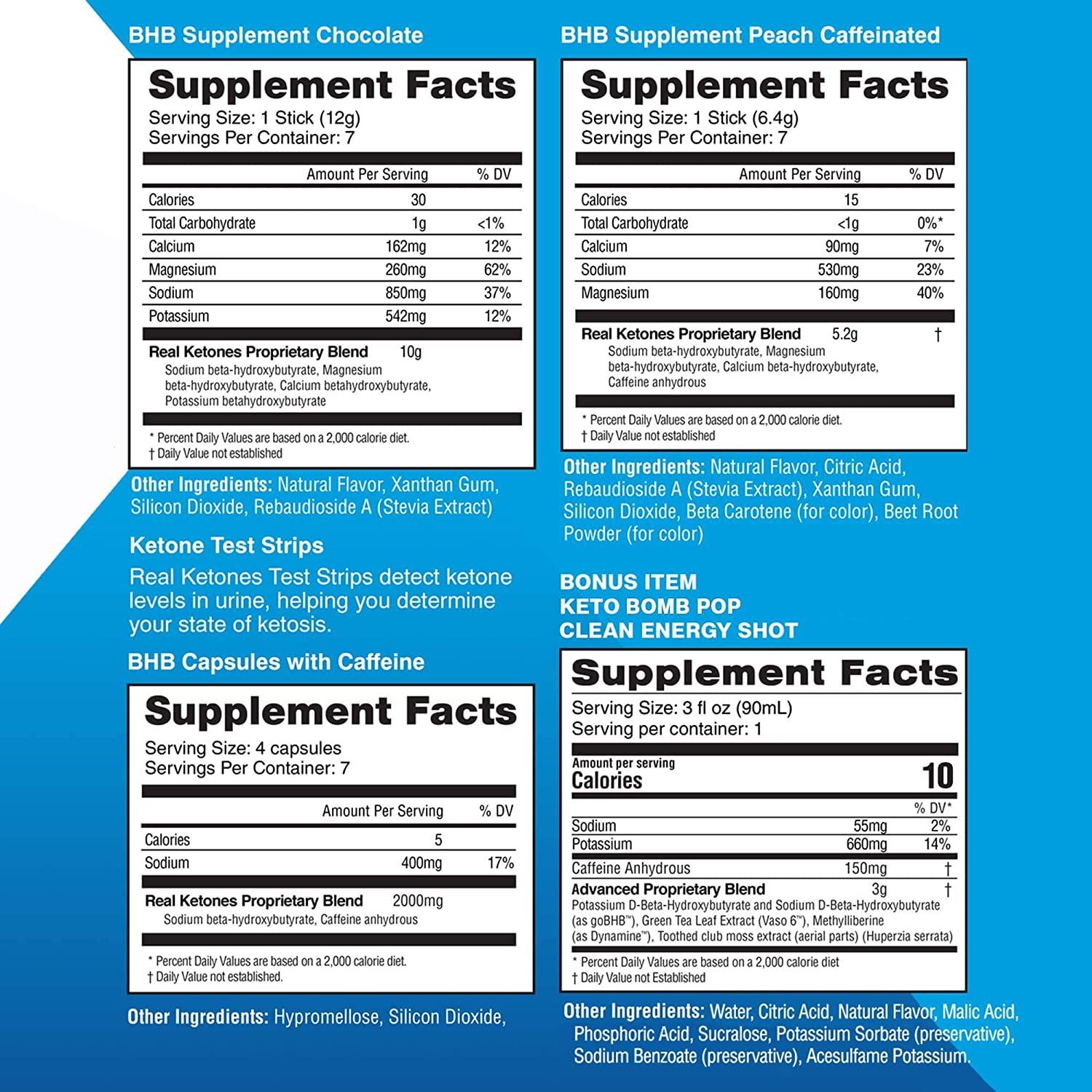 Real Ketones - 7 Day Keto Starter Bundle Kit - Exogenous Ketone BHB Stick Packets, BHB Pills, 15 Urine Test Strips and an Energy Shot Drink