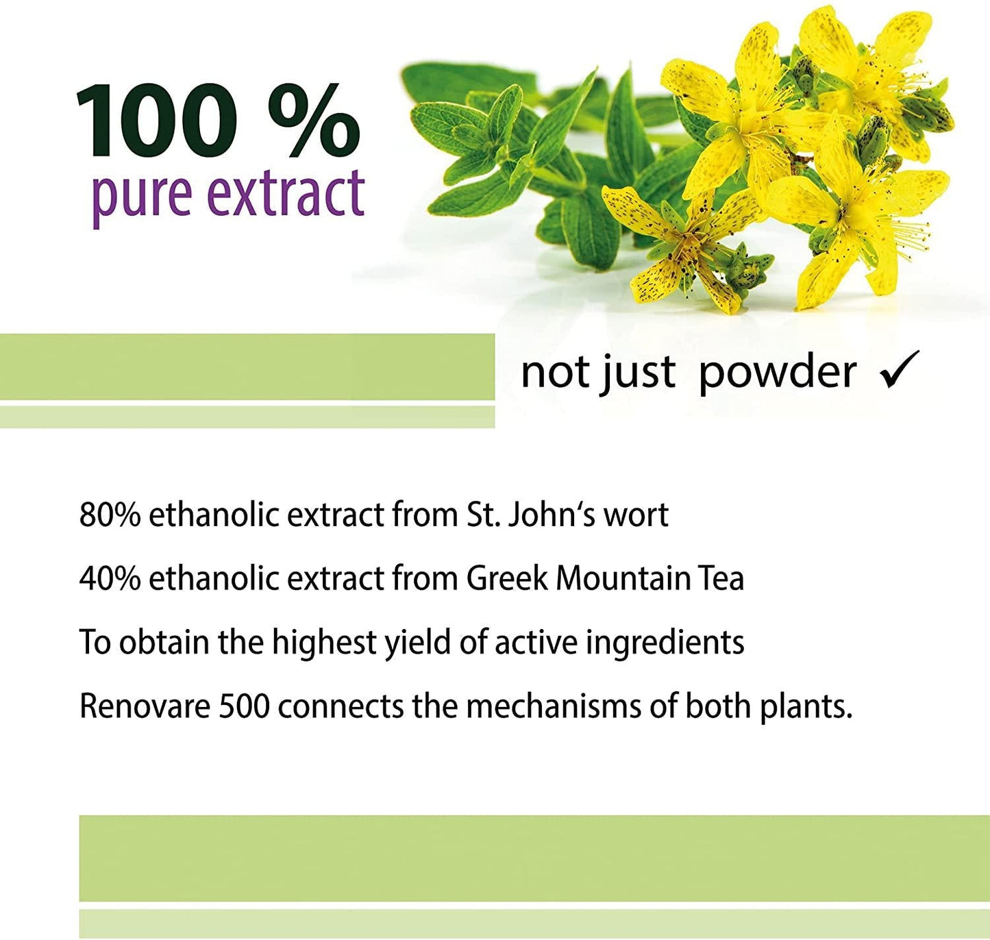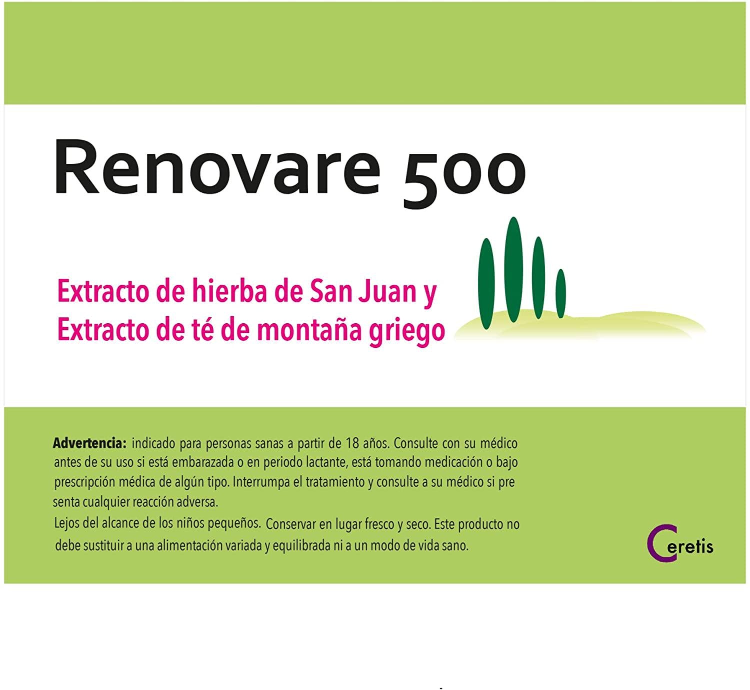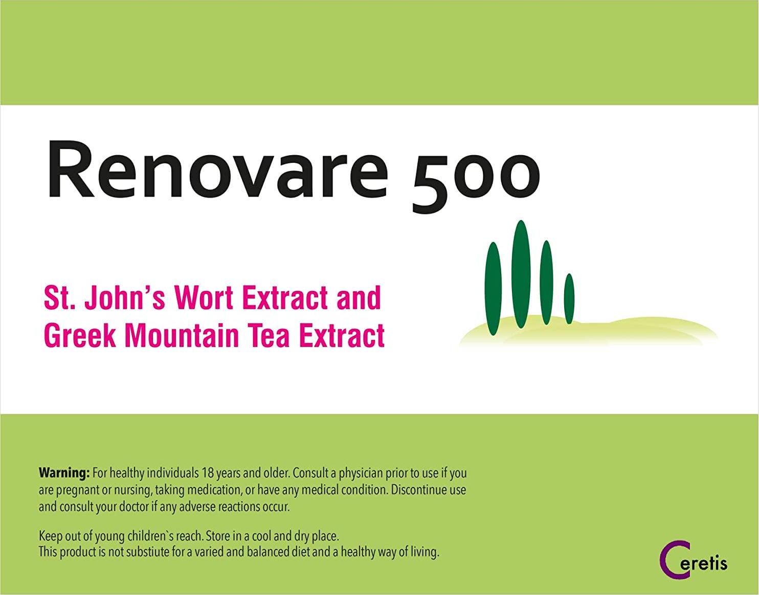 - The main ingredients of Renovare 500 are extracts from St. John's Wort and Greek Mountain Tea.The manufacturing process was developed on the basis of research by Researcher Prof. Jens Pahnke.We use a special extraction process to obtain an 80% ethanolic St. John's Wort extract and a 40% ethanolic extract from Greek Mountain Tea.It is precisely these extracts that have proven to be the most effective combination.The result: maximum effectiveness and quality.