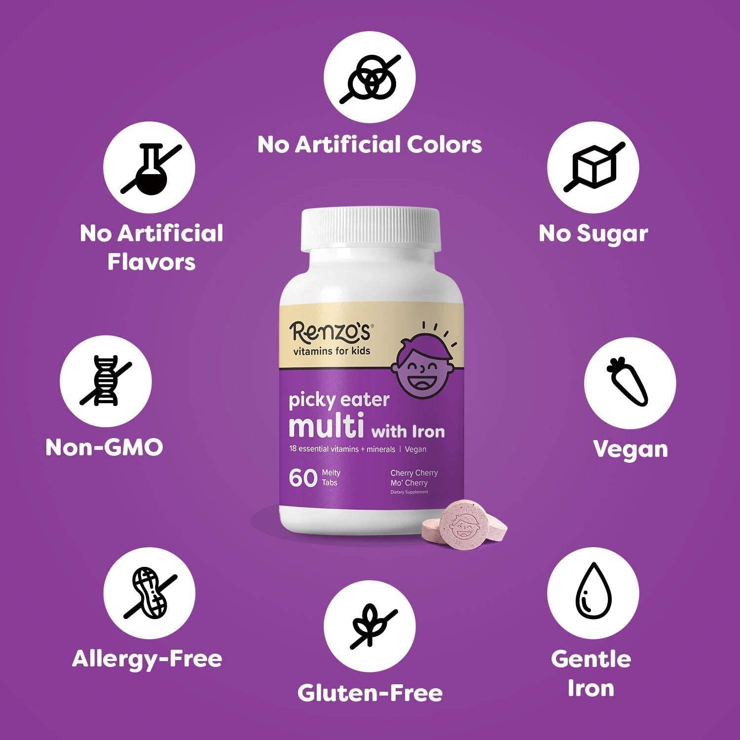 Renzo's Picky Eater Multi, Vegan Dissolvable Vitamins for Kids, Zero Sugar, Cherry Cherry Mo' Cherry Flavour, 60 Melty Tabs