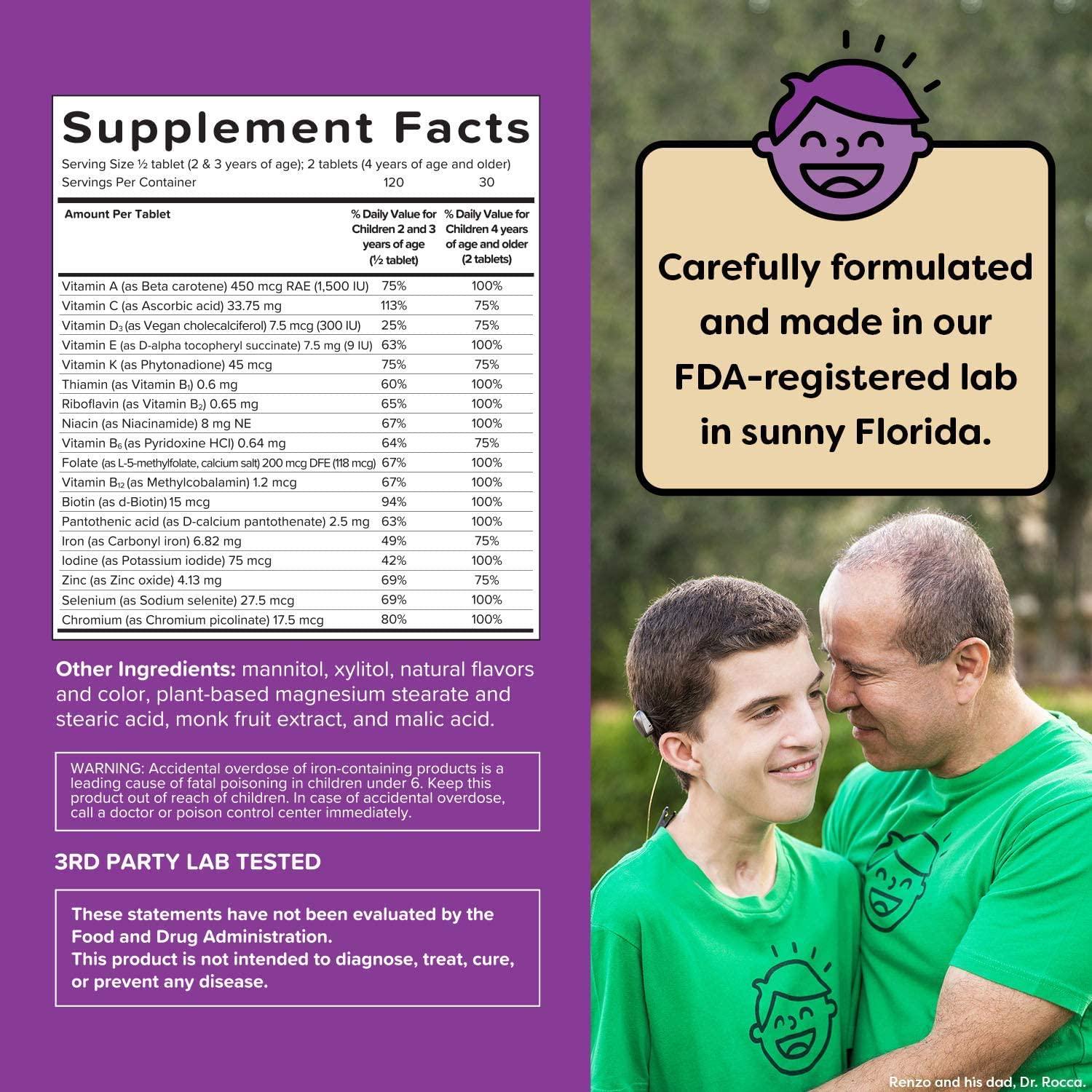 - **Now contains Iron, too!** 18 essential vitamins & minerals in a wholesome, vegan Melty Tab that kids love