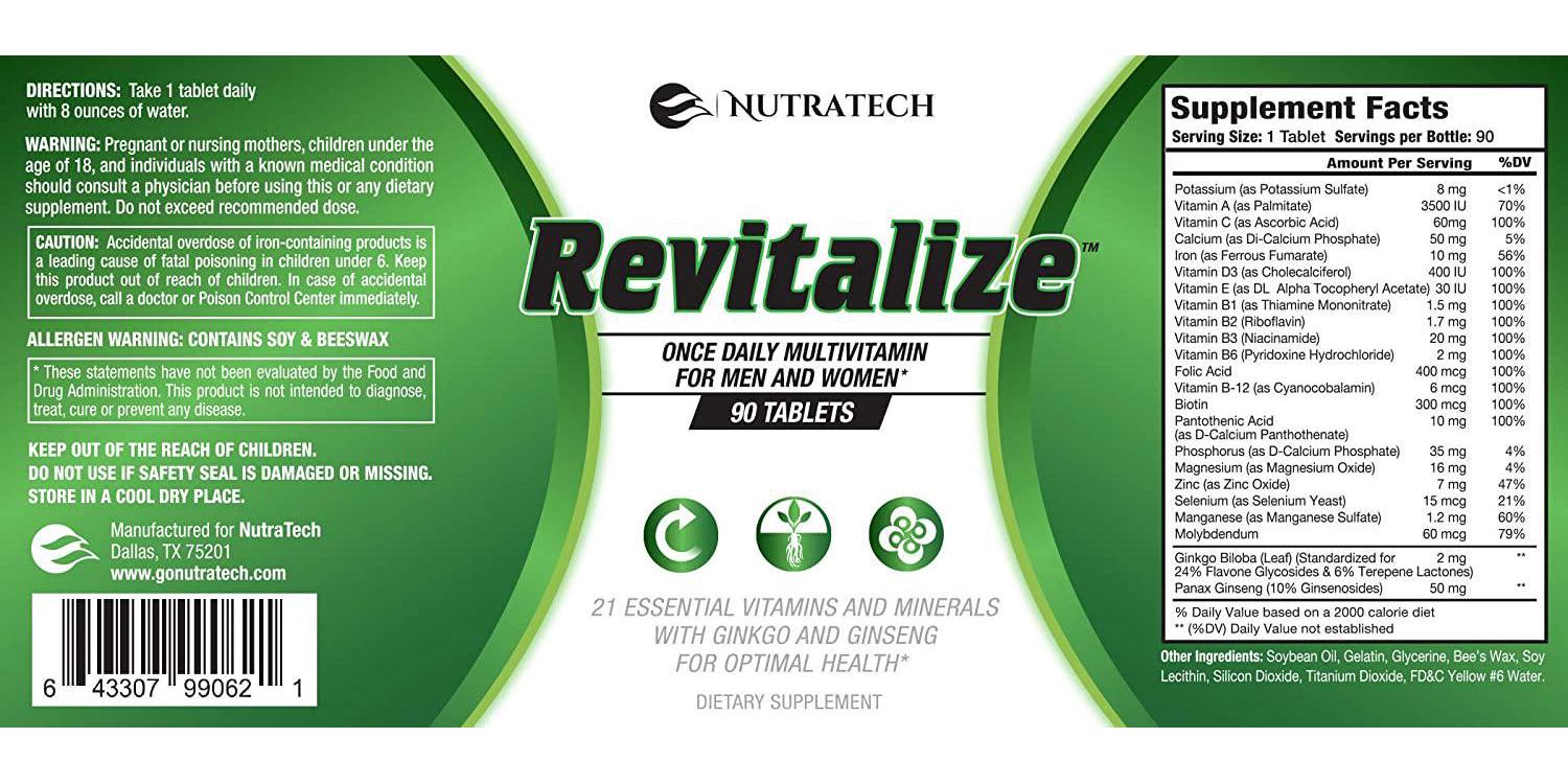- Revitalize is a 100% Organic Multivitamin and made with whole foods for increased absorption and bioavailability. It is formulated to be an effective vitamin supplement for both Men and Women!
