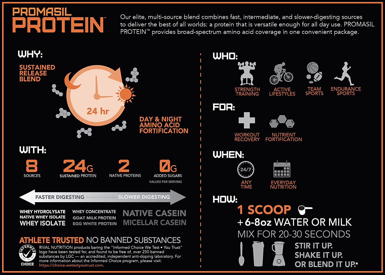 Proteins come in a variety of forms. Sources whey are ideal around workouts when you want aminos - fast. Casein proteins are better between meals and before bed when slower delivery, over several hours, is preferred. Moderate-release proteins egg and goat's milk are easily digested and contain all of the essential amino acids, which makes them great choices most other times. PROMASIL's elite blend combines fast, intermediate, and slower-digesting sources to deliver the best of all worlds: a single protein powder that is versatile enough for all day use. Whether you drink your shake in the morning, after workouts, or between meals, PROMASIL's multi-source blend provides broad-spectrum amino acid coverage in one convenient package.