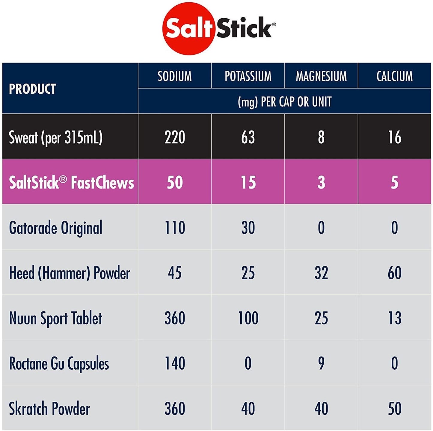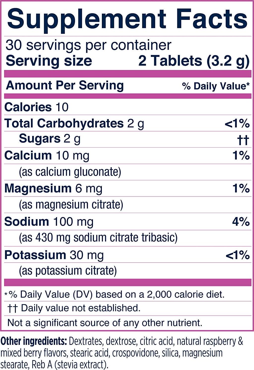 - Suggested use: Chew 2 tablets per 15-30 minutes during activity, each tablet contains 50mg sodium, 15mg potassium, 3mg magnesium, what the body loses through sweat
