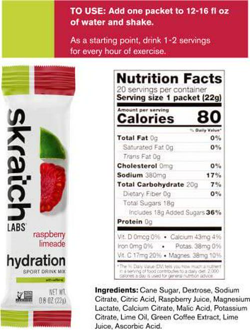 SKRATCH LABS Hydration Packets- Hydration Sport Drink Mix, Raspberry Limeade with Caffeine (20ct)- Electrolyte Powder Developed for Athletes and Sports Performance, Gluten Free, Vegan, Kosher SKRATCH LABS Hydration Packets- Hydration Sport Drink Mix, Raspberry Limeade with Caffeine (20ct)- Electrolyte Powder Developed for Athletes and Sports Performance, Gluten Free, Vegan, Kosher