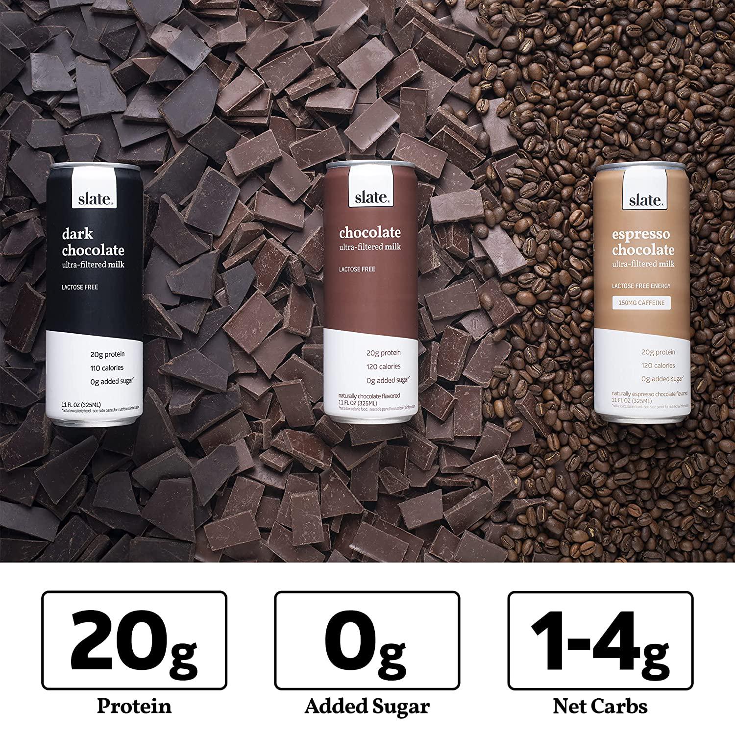 Slate Milk - High Protein Shake, Variety Pack, Chocolate, Dark Chocolate, Espresso Chocolate, 20g Protein, 0g Added Sugar, Lactose Free, Keto, All Natural (11 oz, 12-Pack)