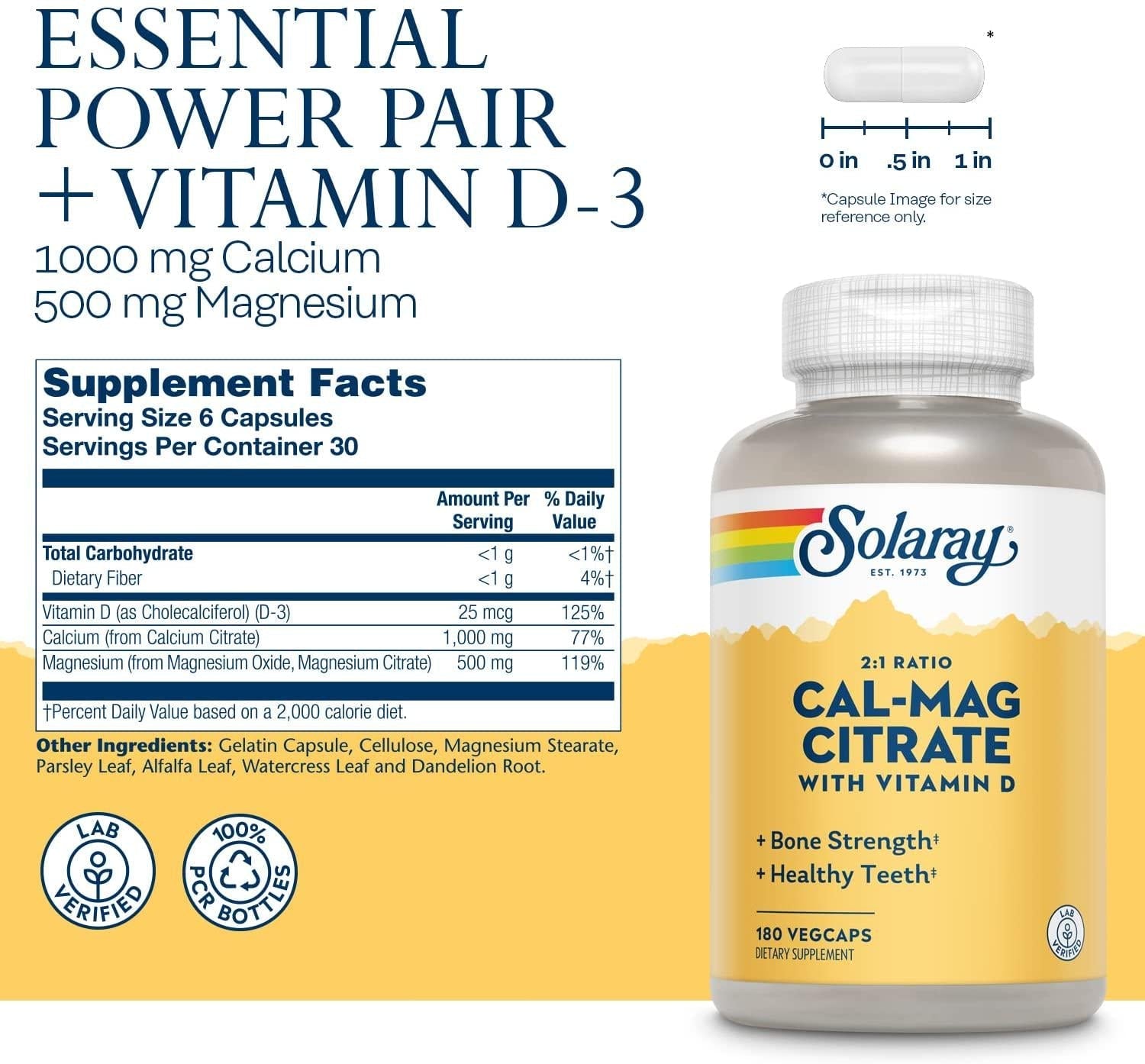 Solaray - Cal-Mag Citrate with 1000 IU Vitamin D3, 2:1 Ratio - 180 Capsules