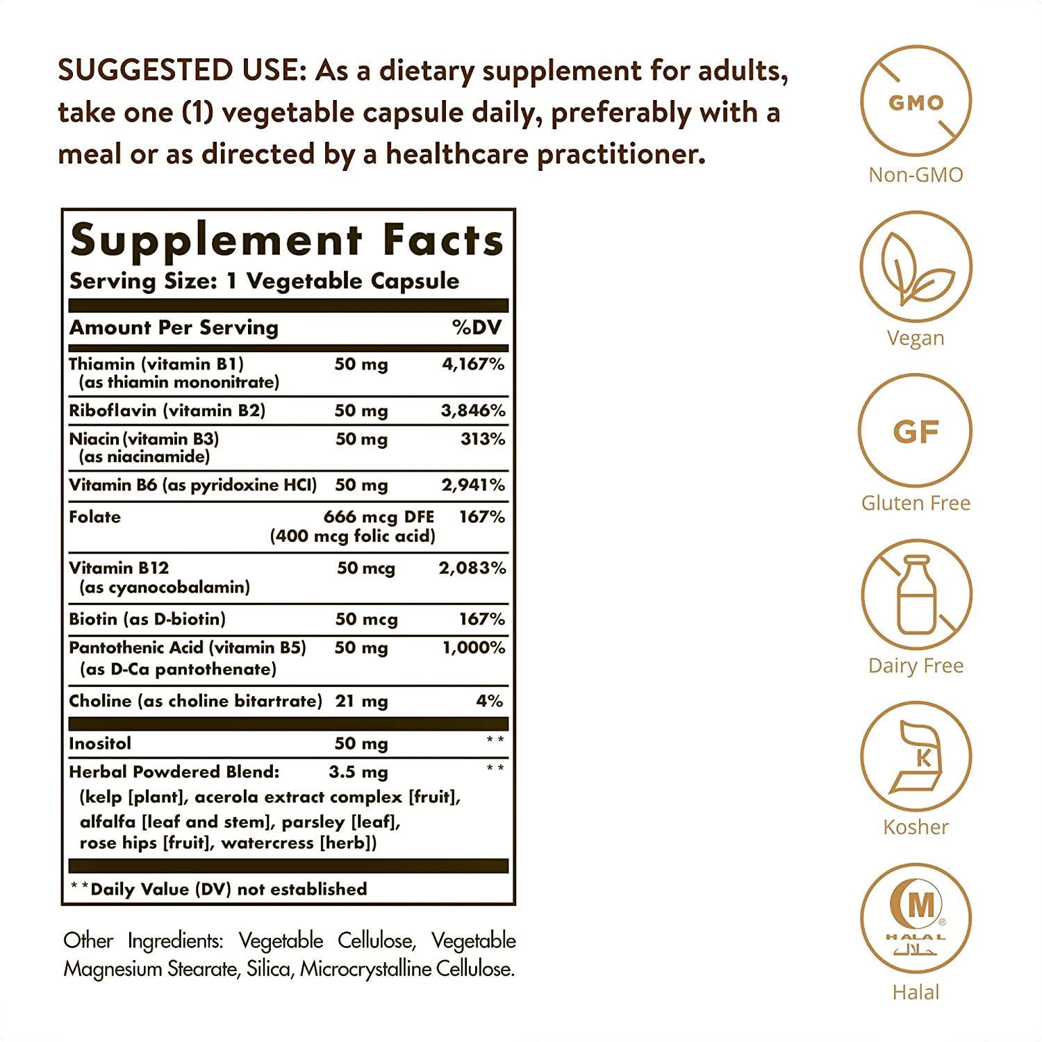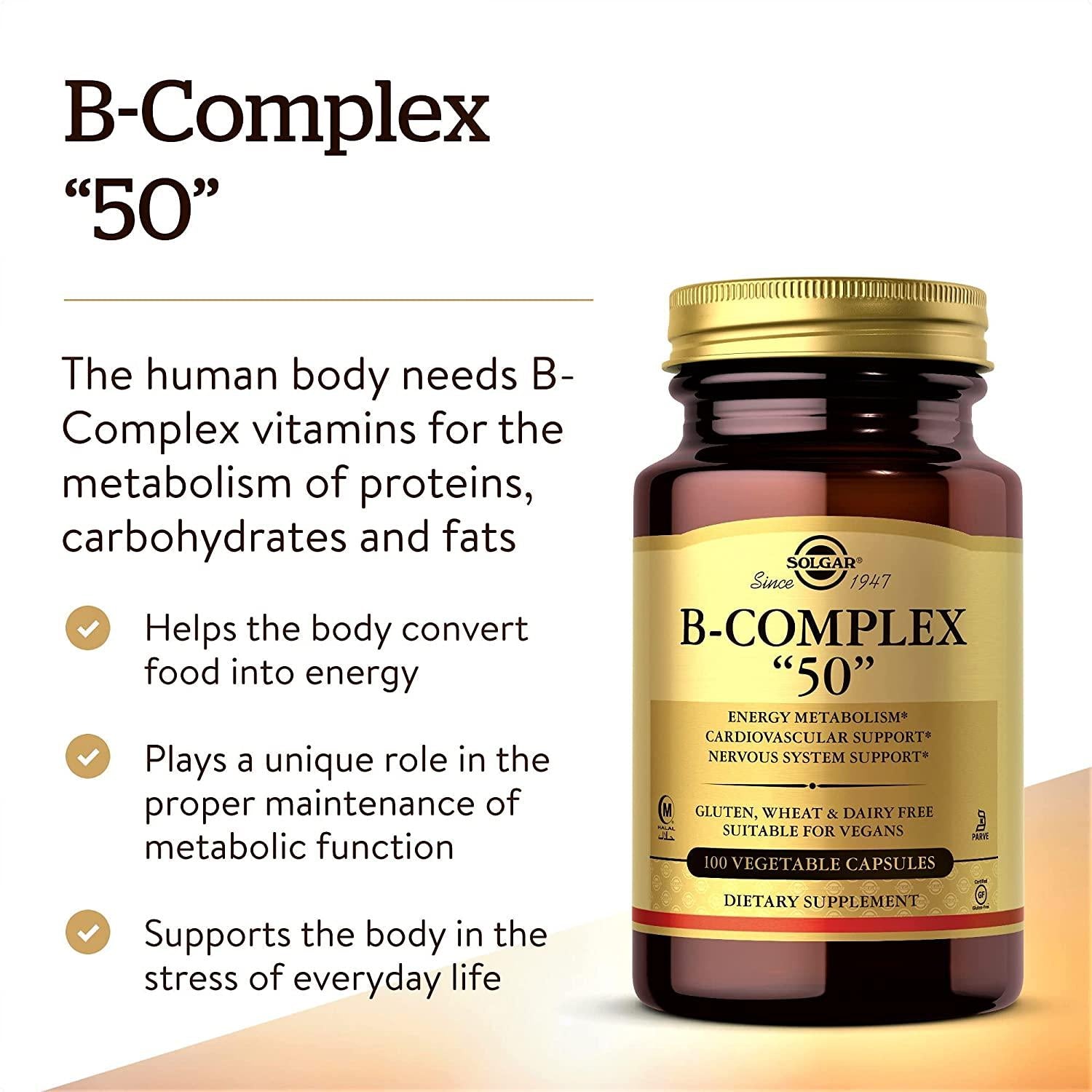 - ADDITIONAL BENEFITS Besides metabolic support, the vitamins found in Solgar B-Complex 50 Vegetable capsules play a much needed role in supporting healthy cardiovascular and nervous systems.