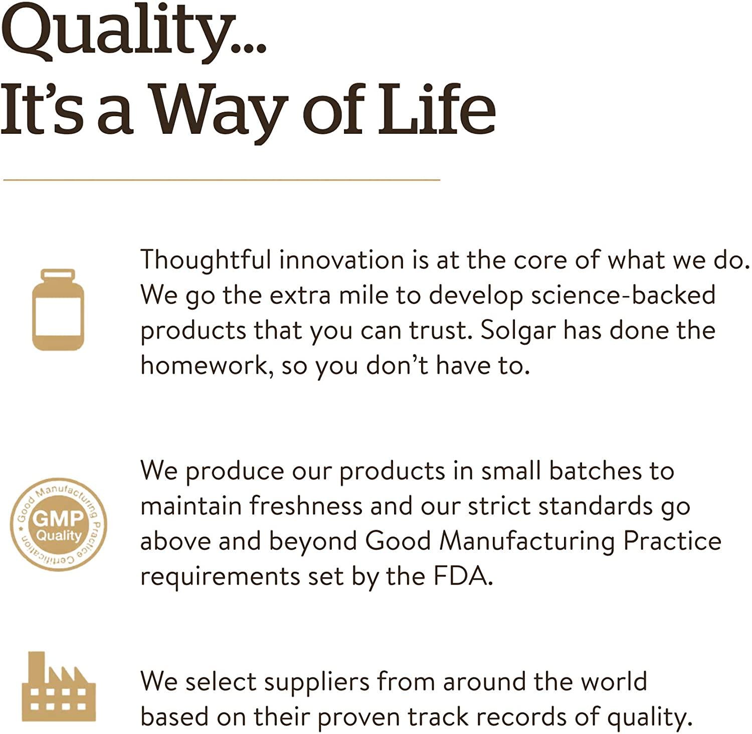 - The Gold Standard: For over 70 years, Solgar has been committed to quality, health, and well-being. Our mission is to create the finest nutritional supplements in small batches, through tireless research, using only the finest raw materials