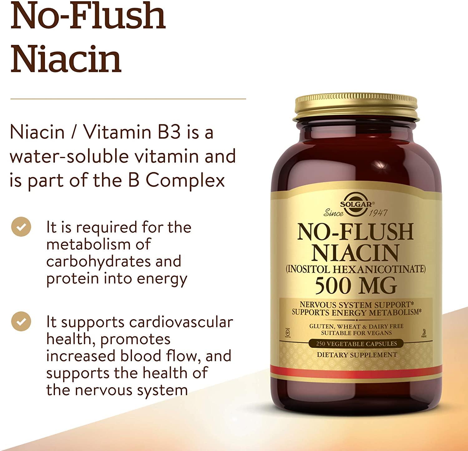 Solgar No-Flush Niacin 500 mg, 250 Vegetable Capsules - Cardiovascular Support - Supports Energy Metabolism - No-Flush Delivery - Vegan, Gluten Free, Dairy Free, Kosher - 250 Servings