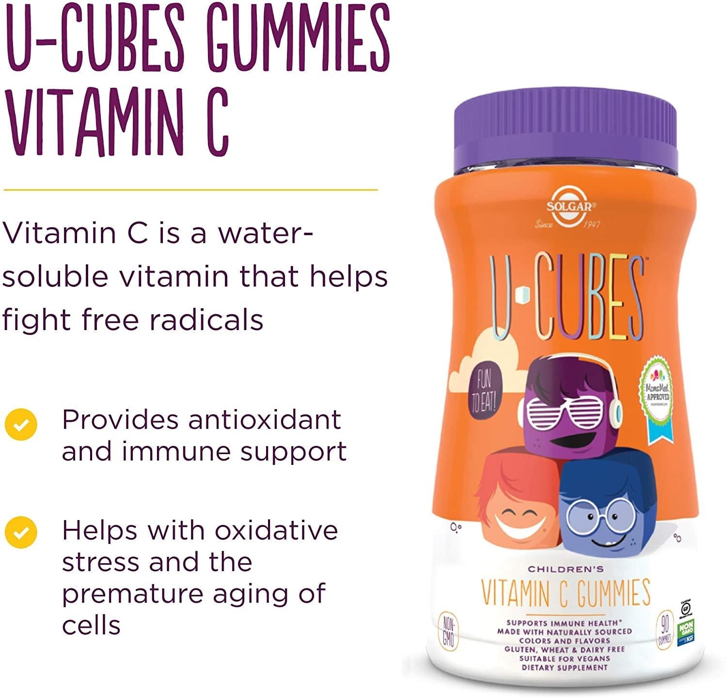 - Great-Tasting Gummies For Kids; Solgar U-Cubes Vitamin C Gummies come in two delicious natural flavors: orange and strawberry; These tapioca-based gummies are a fun way to give your children the nutrients they need