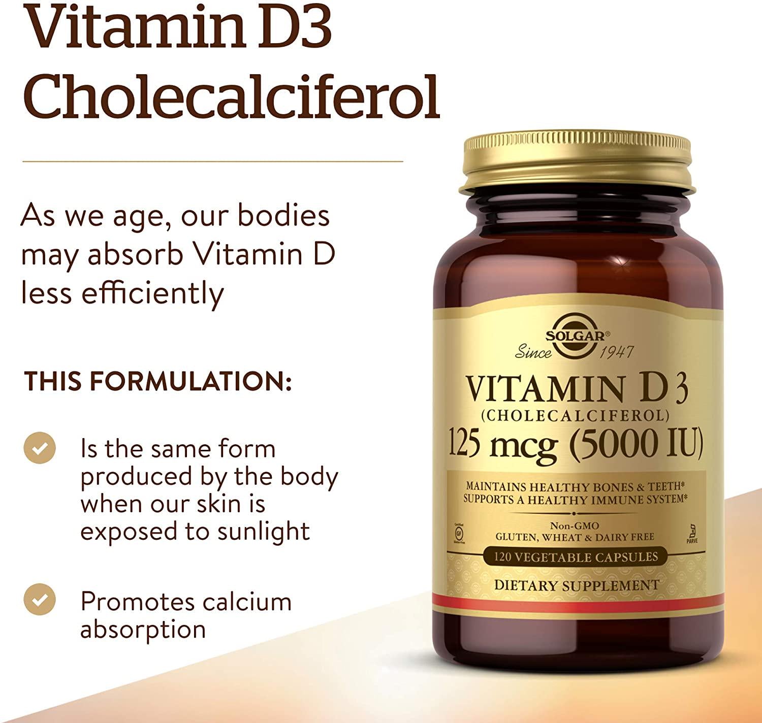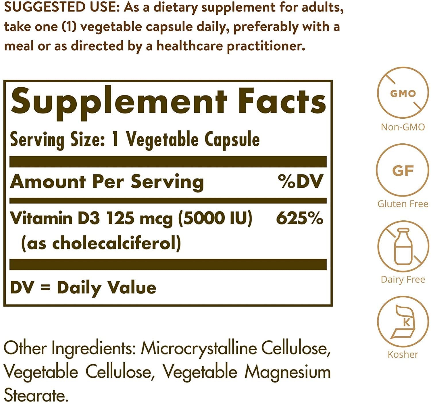 Solgar - Vitamin D3 (Cholecalciferol) 5000 IU Vegetable Capsules 120 Count