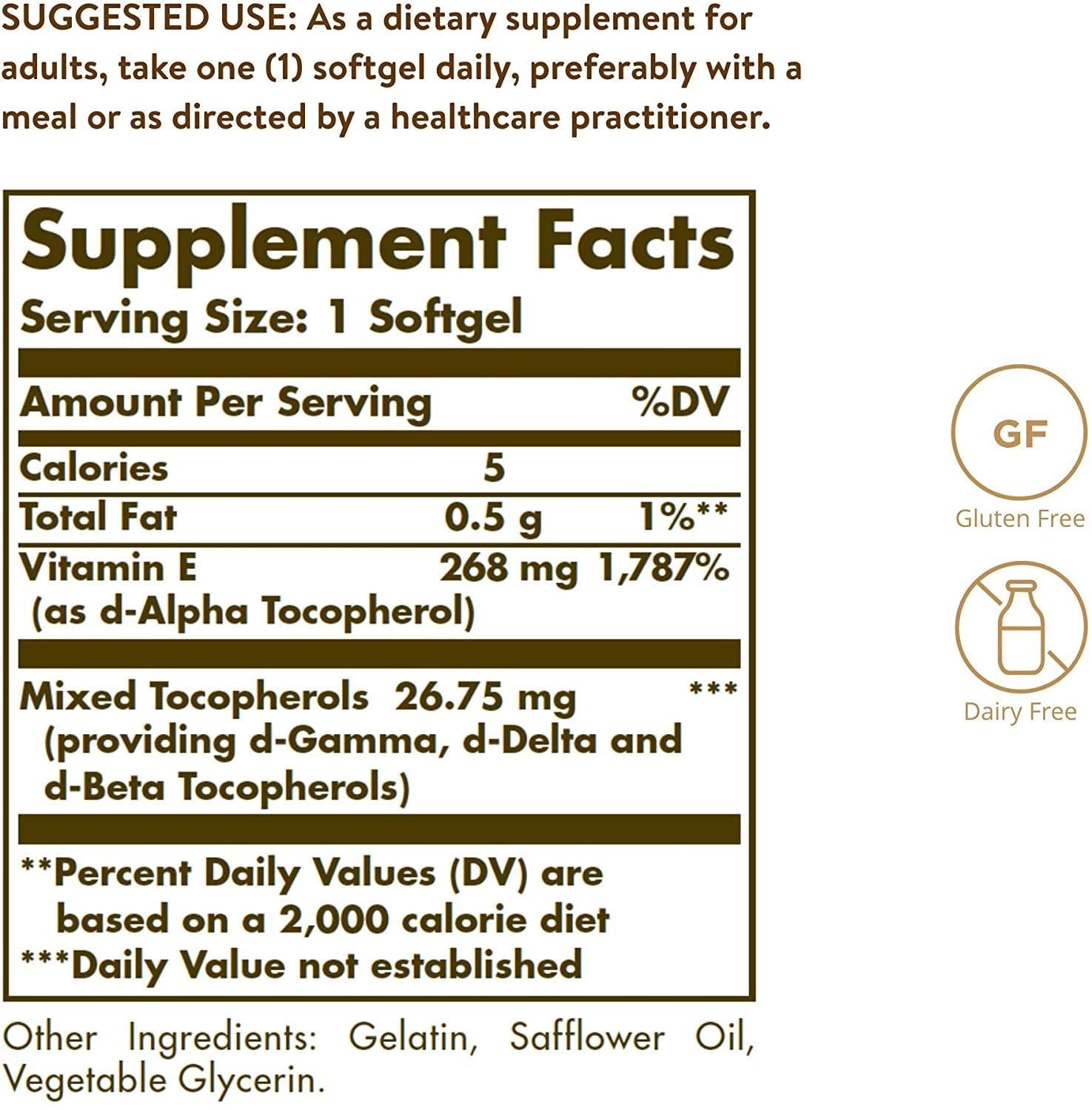 Solgar Vitamin E 400 IU Mixed Softgels D-Alpha Tocopherol and Mixed Tocopherols, 250 Count