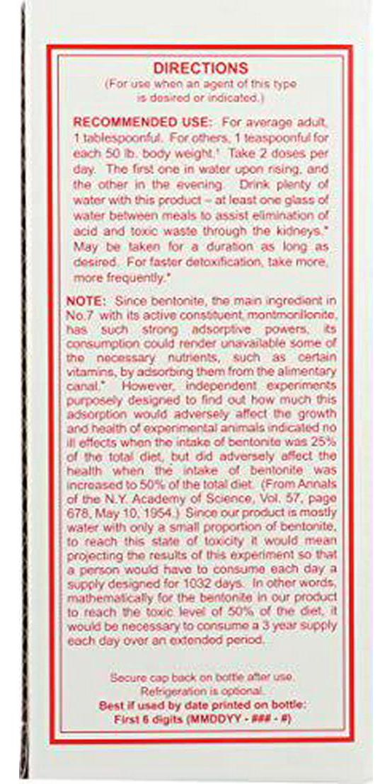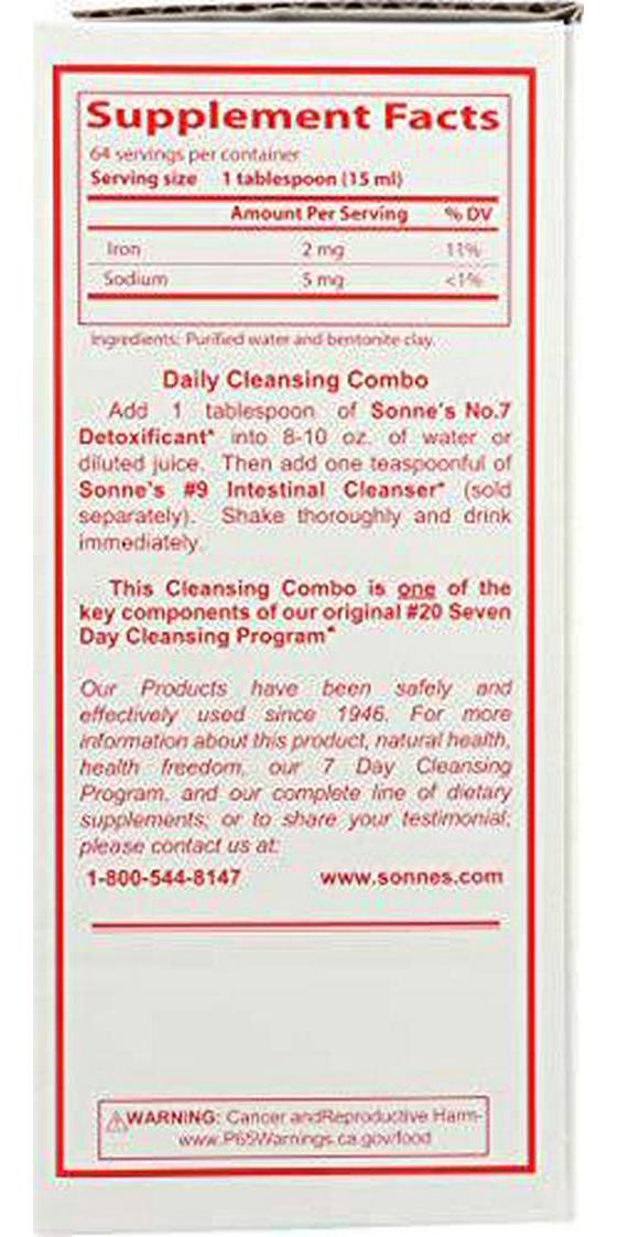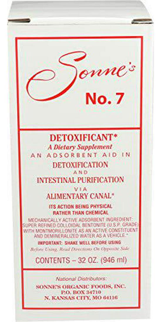 Sonne's Organic Foods - Sonne's No. 7 Detoxification, 32 fl oz liquid. Ingredient: Colloidal Bentonite (U.S.P. GRADE) containing the activeconstituent montmorillonite super-refined with demineralized water as a vehicle.