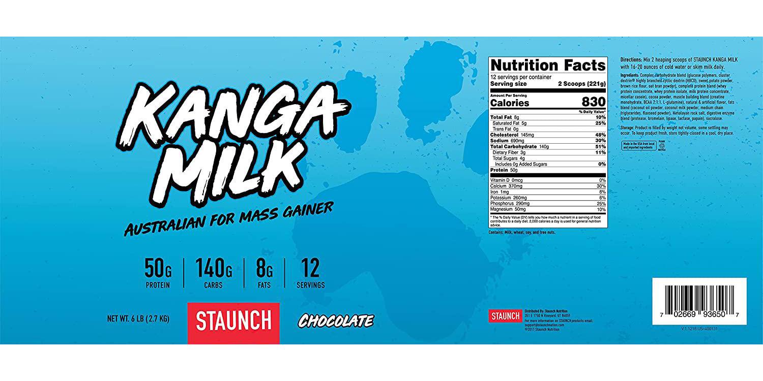 Staunch Kanga Milk is the premiere mass gainer designed for the staunchest athlete looking to build mass without adding unhealthy sugars or fats! While there may be other companies that sell mass gainers filled with calorie, fat and sugar hidden behind proprietary blends, Staunch Kanga Milk provides 50 grams of high quality protein and includes 7 grams of fats and 139 grams of carbs. Staunch has gone the extra mile with Kang Milk delivering a mass gainer featuring a complete Protein Complex, Fat Complex, Carb Complex, Muscle Building Complex and Digestive Enzyme Complex. This powerful mass gainer has everything you need to get you the necessary fuel that your body needs to build mass in the healthiest way possible Even a growing Joey will appreciate this powerful mass gainer formula.