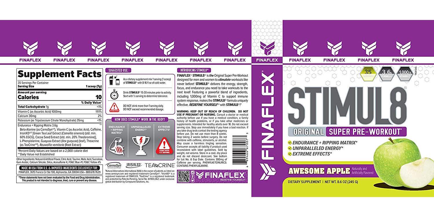 FINAFLEX STIMUL8 is the Original Super Pre-Workout designed for men and women that stimulates workouts never before! The legendary STIMUL8 formula promotes energy, strength, and endurance, taking workouts to the next level! Built with IrisinXD, a blend of ingredients unique to only FINAFLEX products is what makes the STIMUL8 formula so effective! Strive to be Great, Drink STIMUL8!