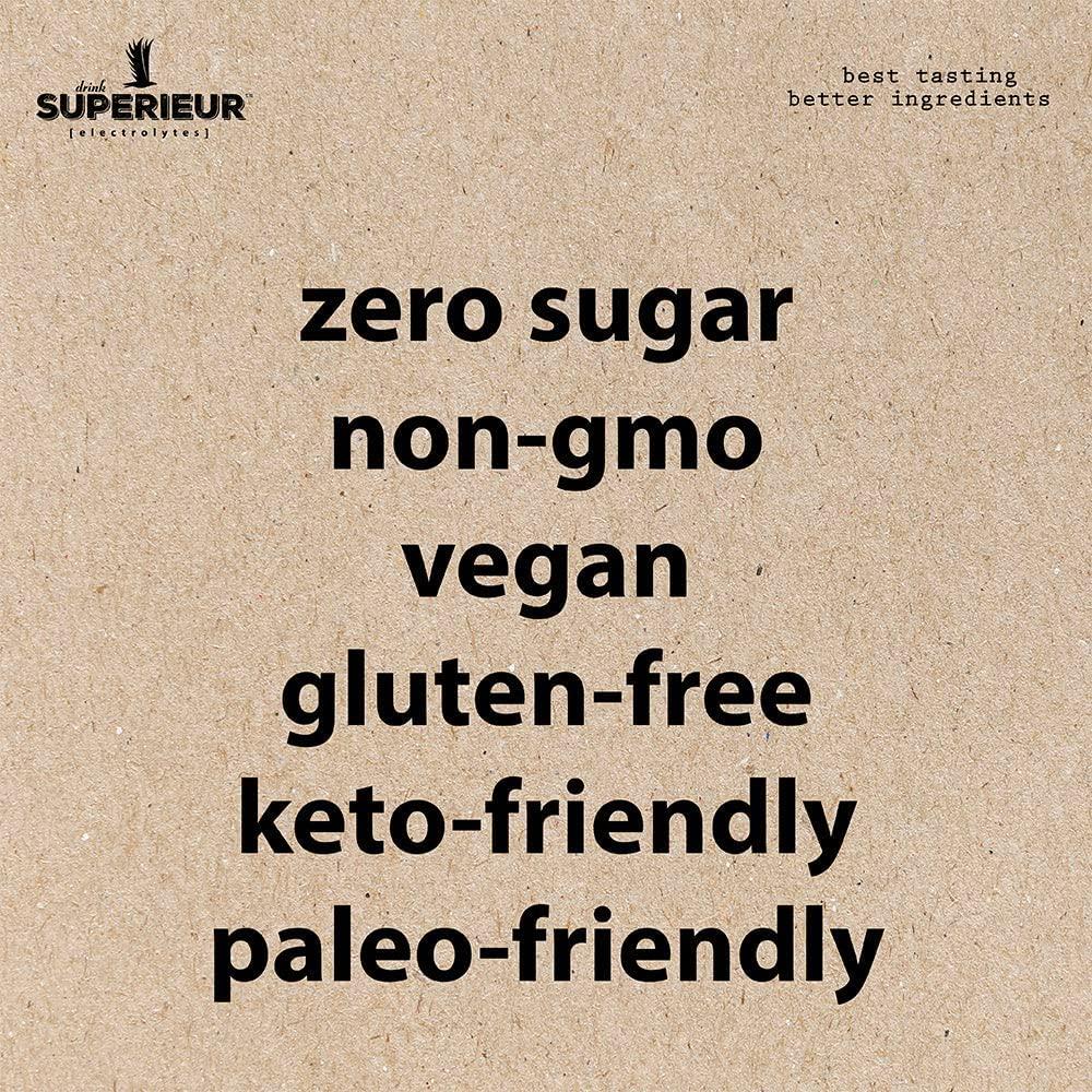 Superieur Electrolytes Fresh Citrus 15 Packets Superieur Electrolytes are a complete electrolyte formula that uses sea salt, sea minerals, real vitamin C and additional antioxidants bamboo stem extract and organic silica. Zero sugar 15 Packets servings Non GMO and Vegan Light and refreshing Can be used before, during, and after activity or anytime