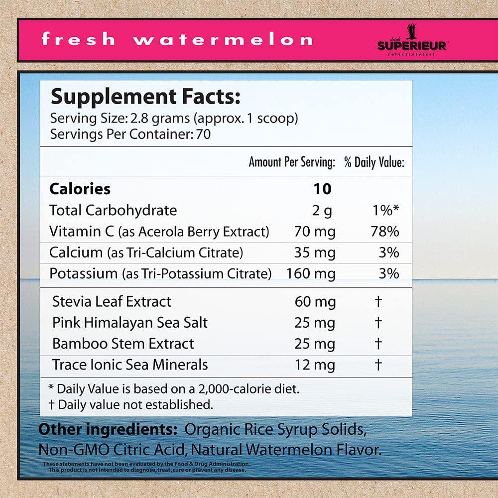 Superieur Electrolytes Plant Based Electrolyte Supplement w/ Sea Minerals for Hydration and Recovery Keto Friendly, Non-GMO, Zero Sugar, Vegan Healthy Sports Drink Powder Watermelon (70 Servings)
