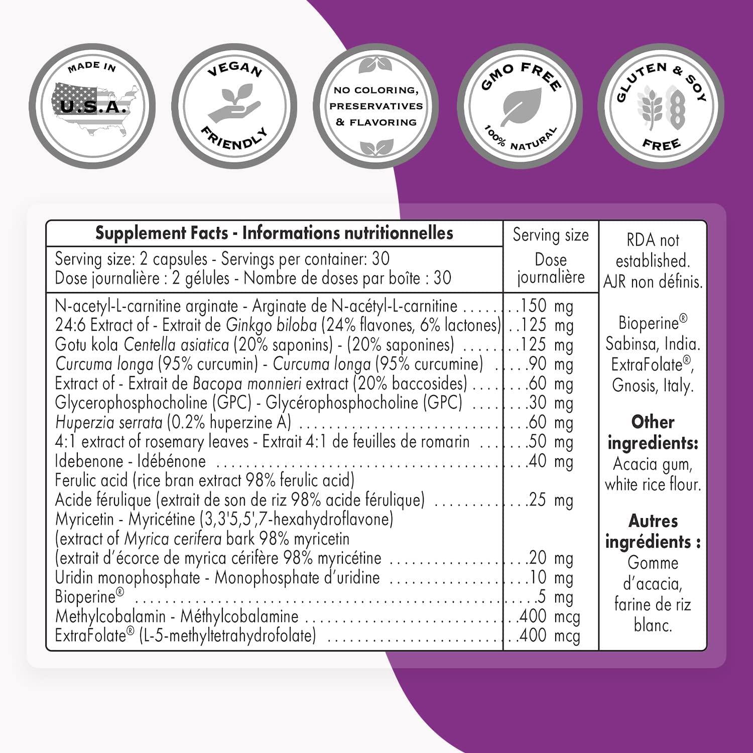 - CONTAIN: N-acetyl-L-carnitine arginate 75mg; Ginkgo biloba extract 62,5mg; Gotu kola Centella asiatica powder (20 % saponins) 62,5mg; Tumeric Curcumin (95 % curcumin) 45mg; Bacopa monnieri extract (20 % baccosides) 30mg; GPC 30mg Huperzia serrata (0.2 % huperzine A)30mg; 4:1 extract of rosemary leaves 25mg; Ferulic acid (rice bran extract 98 %) 12,5mg; Myricetin (myrica cerifera bark extract 98%) 10mg; Uridin monophosphate 5mg; Bioperine 2,5mg; Methylcobalamin 200mcg; ExtraFolate 200mcg;