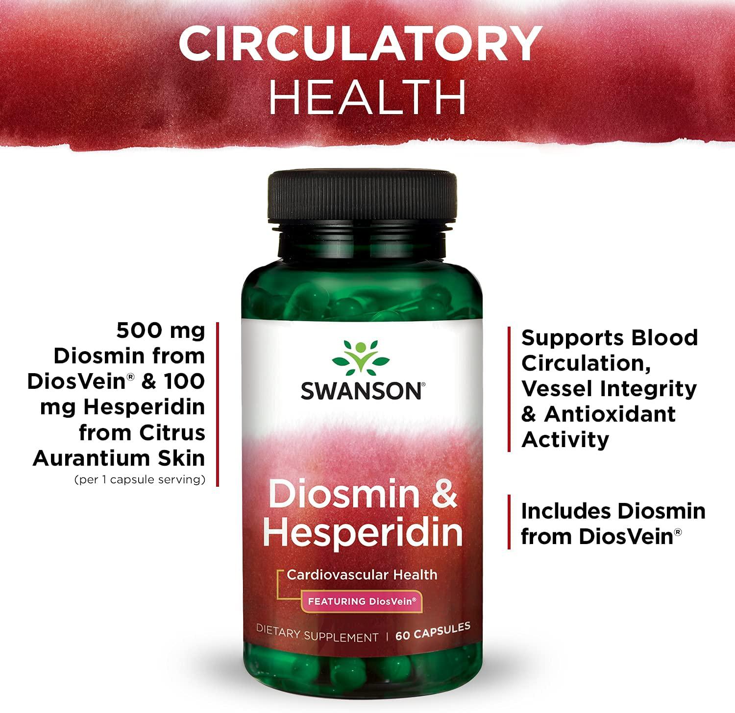 - NEUTRALIZE FREE RADICALS - Swanson DiosVein Diosmin and Hesperidin vein health supplement is formulated with two potent antioxidant flavonoids. Each capsule contains 500 mg of Diosmin (from DiosVein) and 100 mg of Hesperidin to support blood flow and circulation health, cardiovascular health, and the youthful appearance of the legs.
