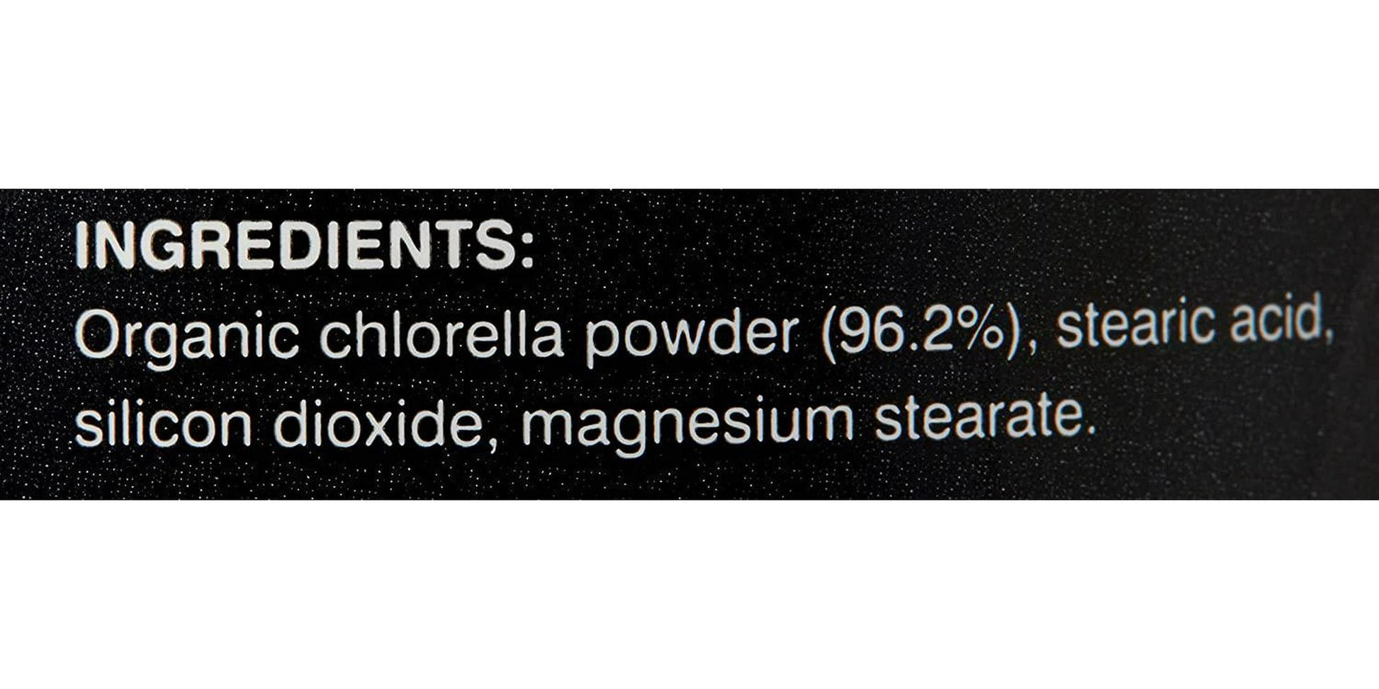 Organic Chlorella powder 99%, Stearic acid, Silicon Dioxide, Magnesium Stearate.