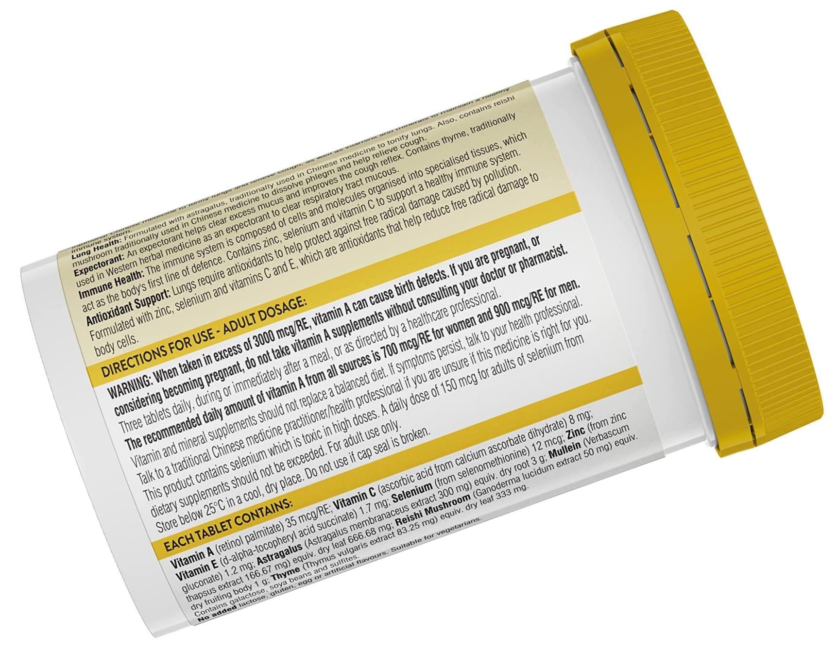 Lung & Respiratory Health: Formulated with reishi mushroom, which has been used in Traditional Chinese Medicine to help support healthy respiratory system function. This formulation also contains astragalus, which has been used in Traditional Western Herbal and Chinese Medicine as a lung tonic. Soothing Properties: Formulated with mullein which is traditionally used in Western Herbal Medicine as a demulcent to help soothe inflamed surfaces within the respiratory system. Expectorant: An expectorant helps clear excess mucus and improves the cough reflex. This comprehensive formula contains thyme, traditionally used in Western Herbal Medicine for its action as an expectorant. Immune Health: The immune system is composed of cells and molecules organised into specialised tissues, which act as the body's first line of defence. This premium quality formula contains zinc, selenium and vitamins A & C, to support a healthy immune system. Antioxidant Support: Lungs require antioxidants to help protect against free radical damage caused by pollution. Swisse Ultiboost Lung Health Support is formulated with zinc, selenium and vitamins C & E, which are antioxidants that help protect cells from potential free radical damage. Swisse Ultiboost Lung Health Support has been formulated based on scientific and traditional evidence to provide a comprehensive formula that helps protect lungs from modern environmental influences. Support is a premium quality formula containing essential herbs, vitamins and minerals to support lung and respiratory health, as well as help maintain a healthy immune system.