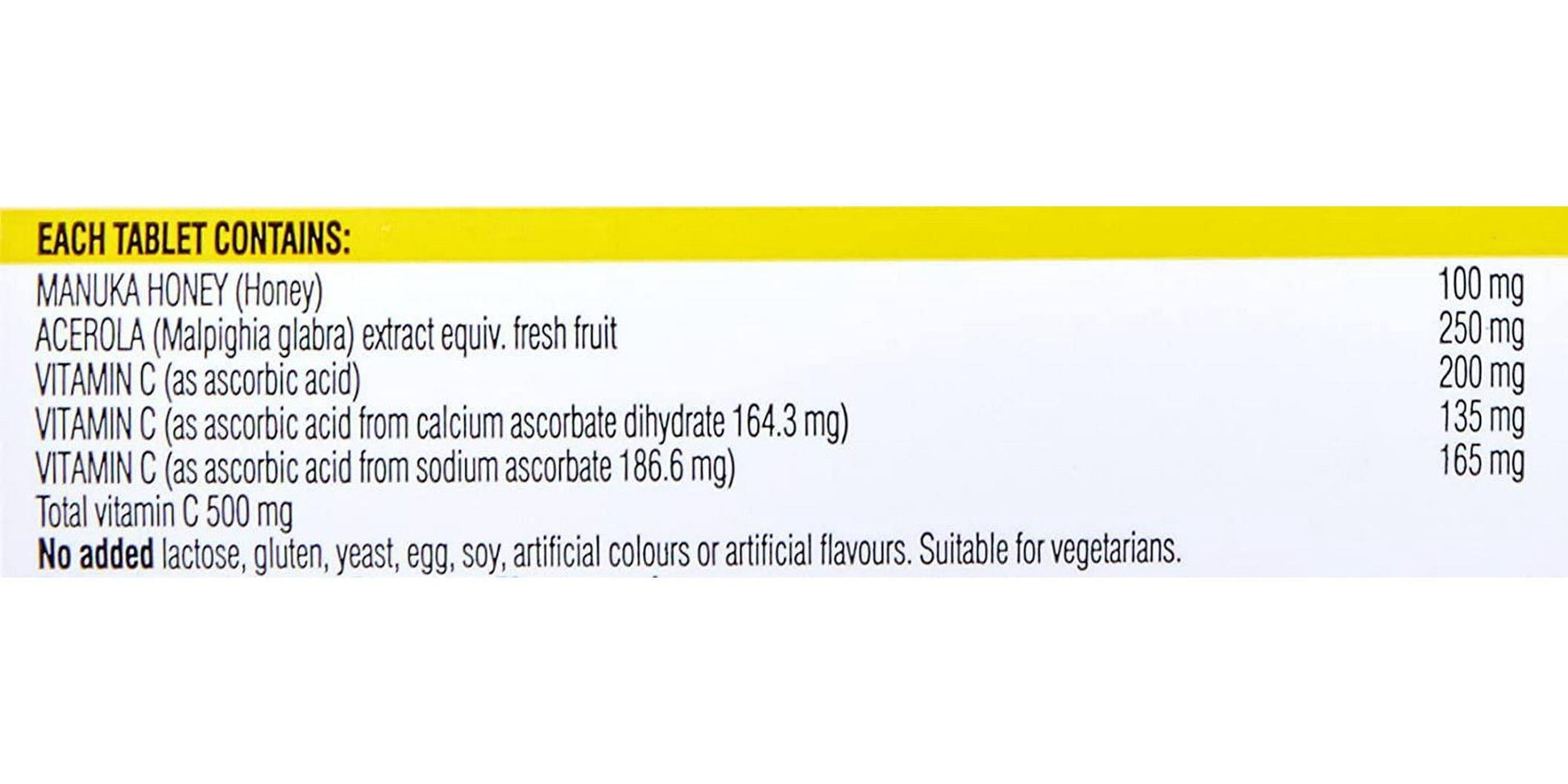 EACH TABLET CONTAINS:. MANUKA HONEY (Honey) 100 mg. ACEROLA (Malpighia glabra) extract equiv. fresh fruit 250 mg. VITAMIN C (as ascorbic acid) 200 mg. VITAMIN C (as ascorbic acid from calcium ascorbate dihydrate 164.33 mg) 135 mg. VITAMIN C (as ascorbic acid from sodium ascorbate 186.67 mg) 165 mg. Total Vitamin C 500 mg
