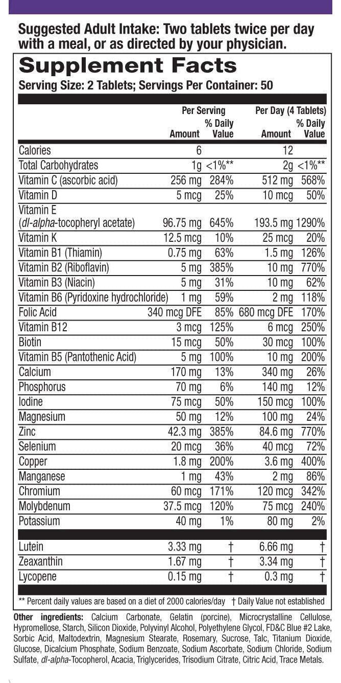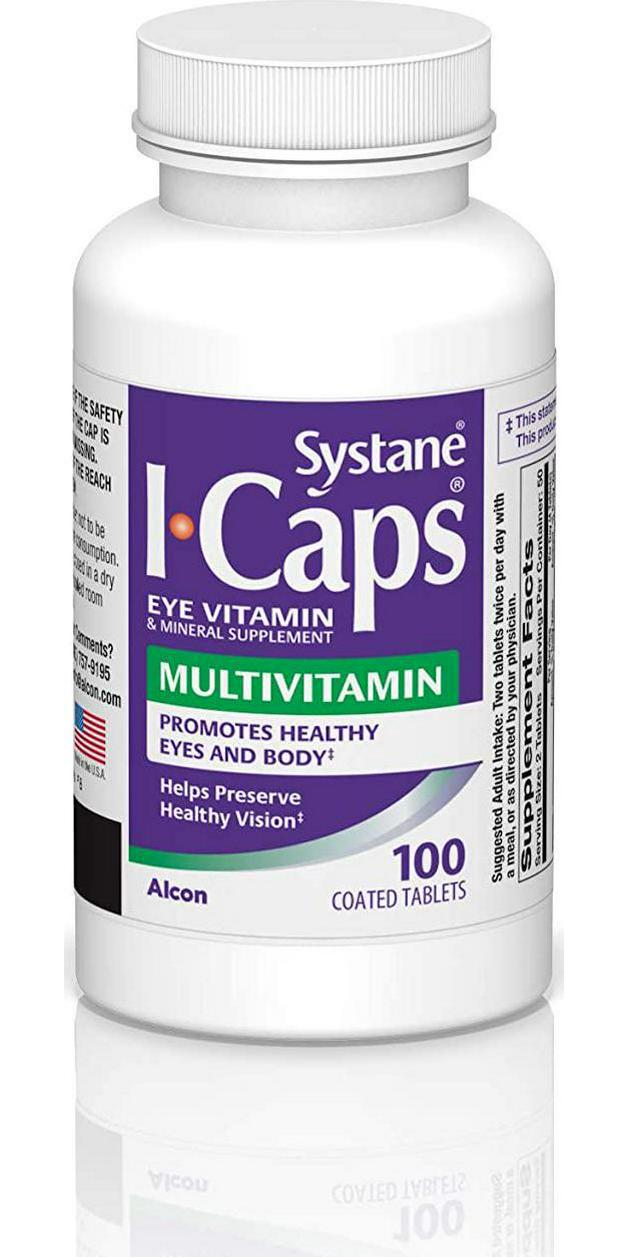 Systane ICaps Eye Vitamin & Mineral Supplements are designed to support healthy eyes. The multivitamin formula supports overall eye and body health, without beta-carotene. This supplement is available in delayed-release tablets that are easier on your stomach and promote better absorption. The suggested adult intake is two tablets, twice per day with a meal or as directed by your physician. Systane ICaps MV lutein-enriched multivitamins provide high levels of lutein and zeaxanthin specifically for eye health in a multivitamin formula for overall body health in one formulation that is free of vitamin A for those who should avoid beta-carotene. Systane ICaps provide a wide spectrum of important ingredients shown to support eye health and vision. Lutein and Zeaxanthin are part of a group of antioxidants called carotenoids, which are yellow, orange and red pigments synthesized by plants. Zinc is an essential trace mineral that is highly concentrated in the eyes, mostly in the retina and the underlying tissue. Vitamins A, C and E are three vitamins that scientists have identified as particularly important to eye health. Omega-3 Fatty Acids are essential fatty acids that your body uses to produce new cells, muscles, nerves and organs. With several varieties, theres an ICaps Eye Vitamin that fits your life.