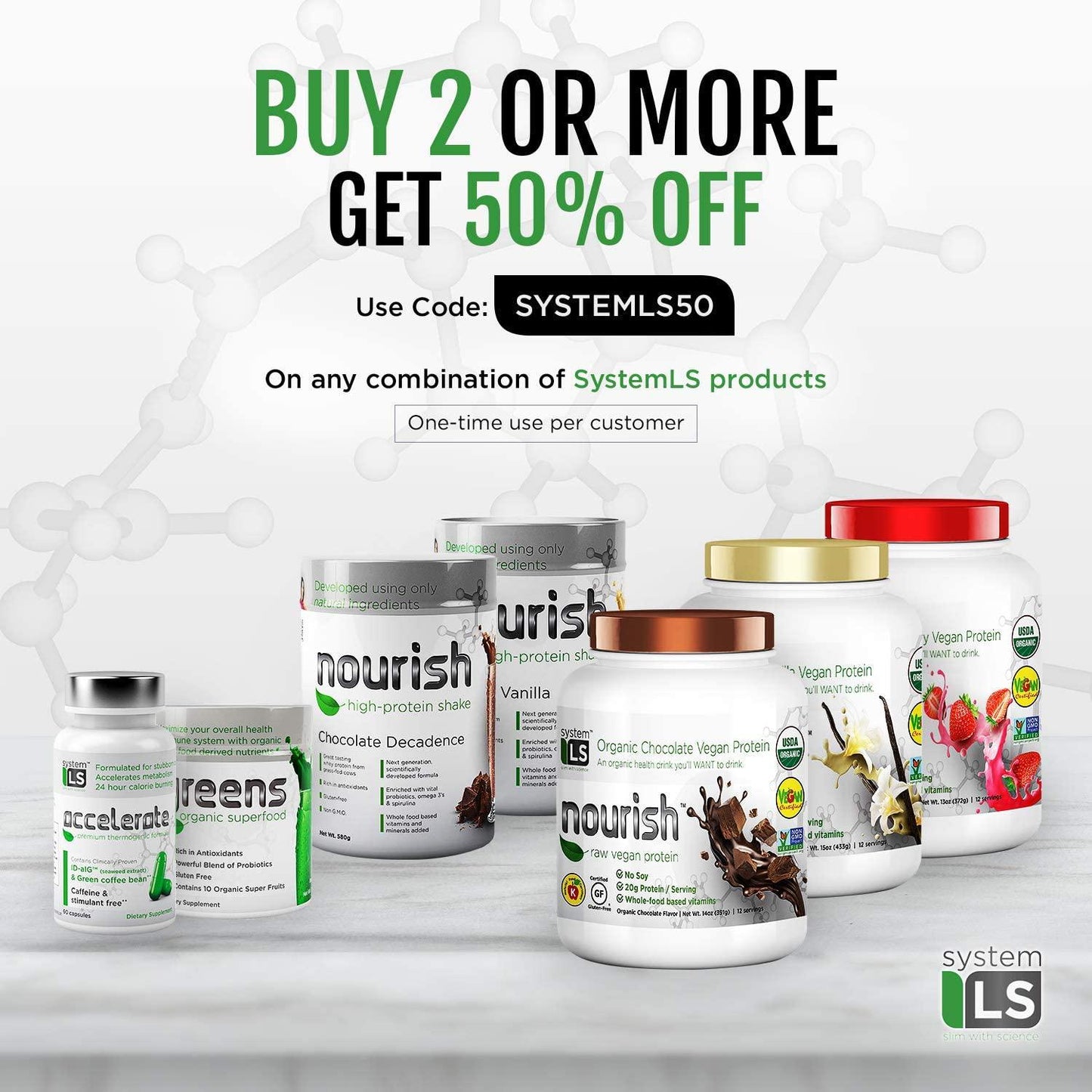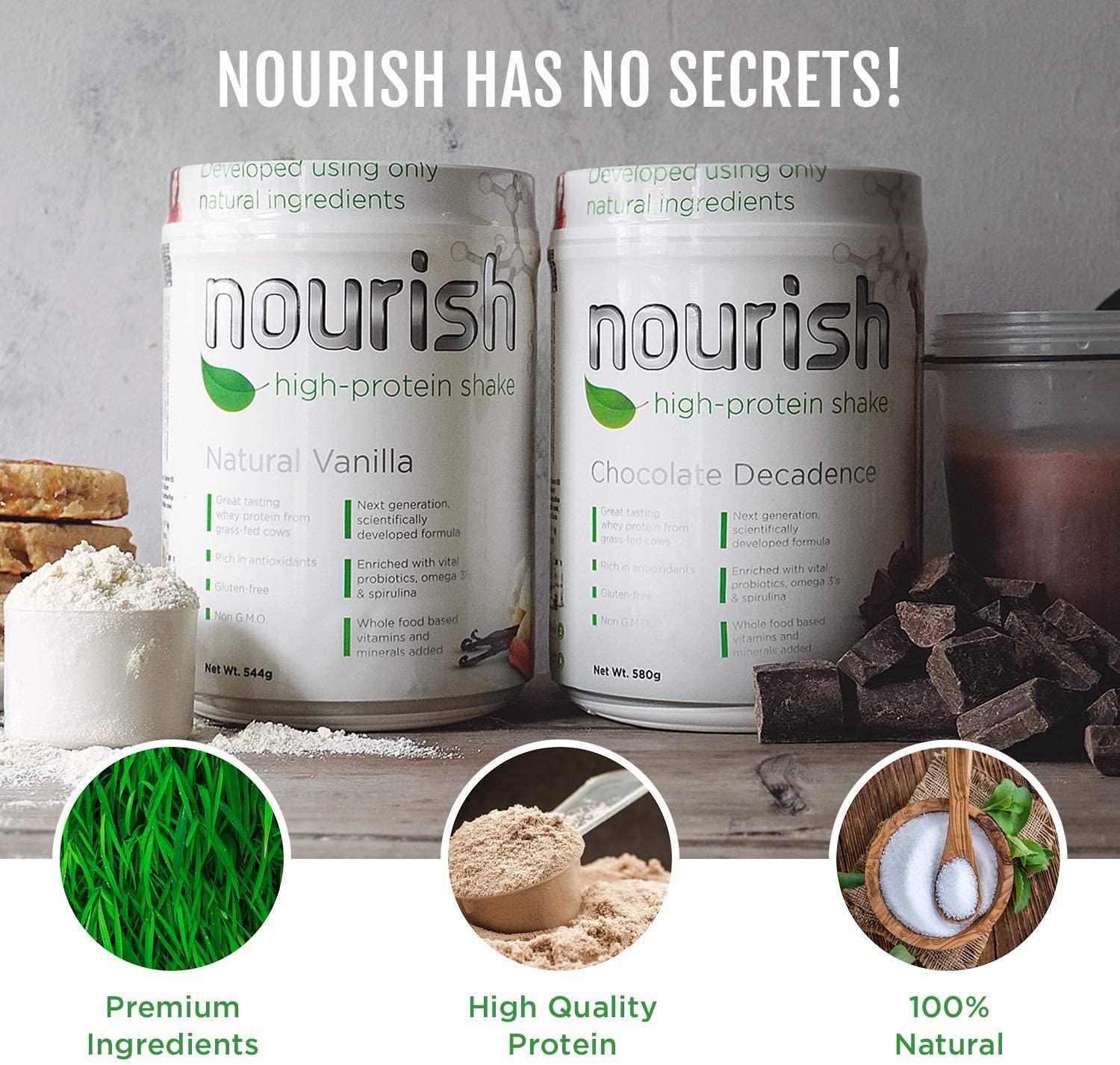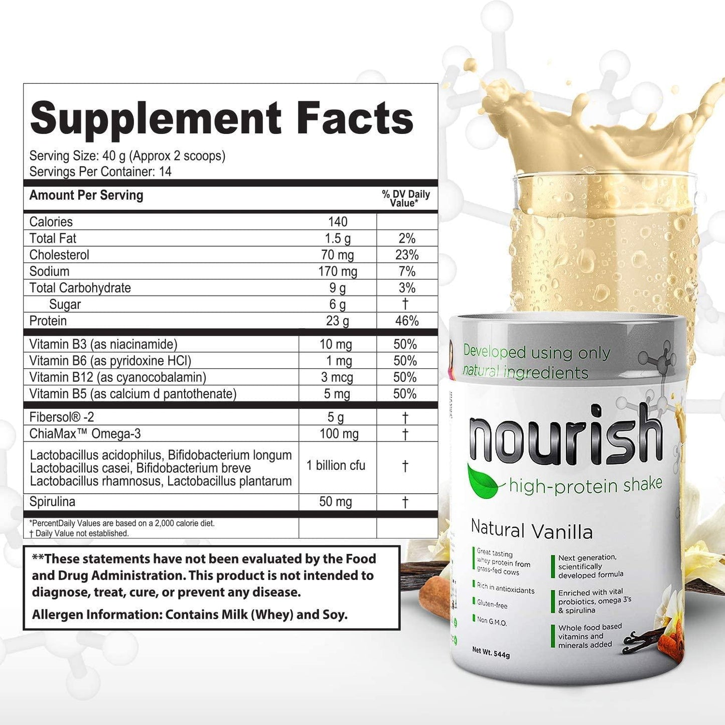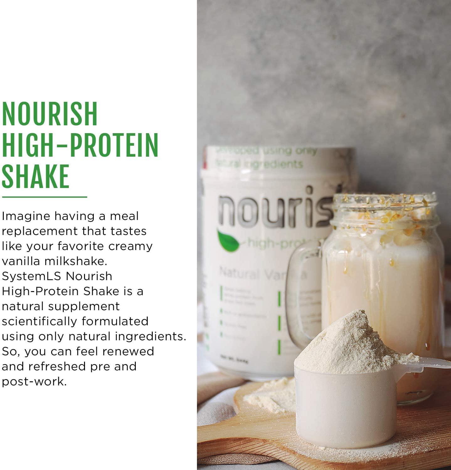 System LS Nourish High Protein Shake is fortified with potent, natural ingredients whey protein from grass-fed cows, probiotics, omega 3's, spirulina and enriched with essential B vitamins. Nourish is true 'meal replacement', high in protein, low in fat and 100 percent natural goodness. Probiotics to encourage beneficial gut flora, enhanced gut health and increased immune function. Omega 3s for anti-inflammatory properties and bone, brain and heart healthy benefits. Fibersol - providing a whopping 5 g per serve - to promote strong digestion and the elimination of toxins, providing a natural way to control cravings. Spirulina for whole food based vitamins and minerals that aid increased nutrient absorption. Chiamax - an omega-3, low fat whole grain super-food naturally derived from a proprietary partially defatted whole grain that is gluten-free and great tasting. High quality protein and fiber to naturally combat cravings and hunger and regulate appetite hormones. It has no artificial flavors or sweeteners. Whole food based essential B vitamins for maximizing your energy and stamina. Premium Ingredients: To help you achieve your goals of weight loss, energy and health, a quality product should contain a short list of only natural ingredients to support your bodys natural biochemistry. Flavor: Natural Vanilla.