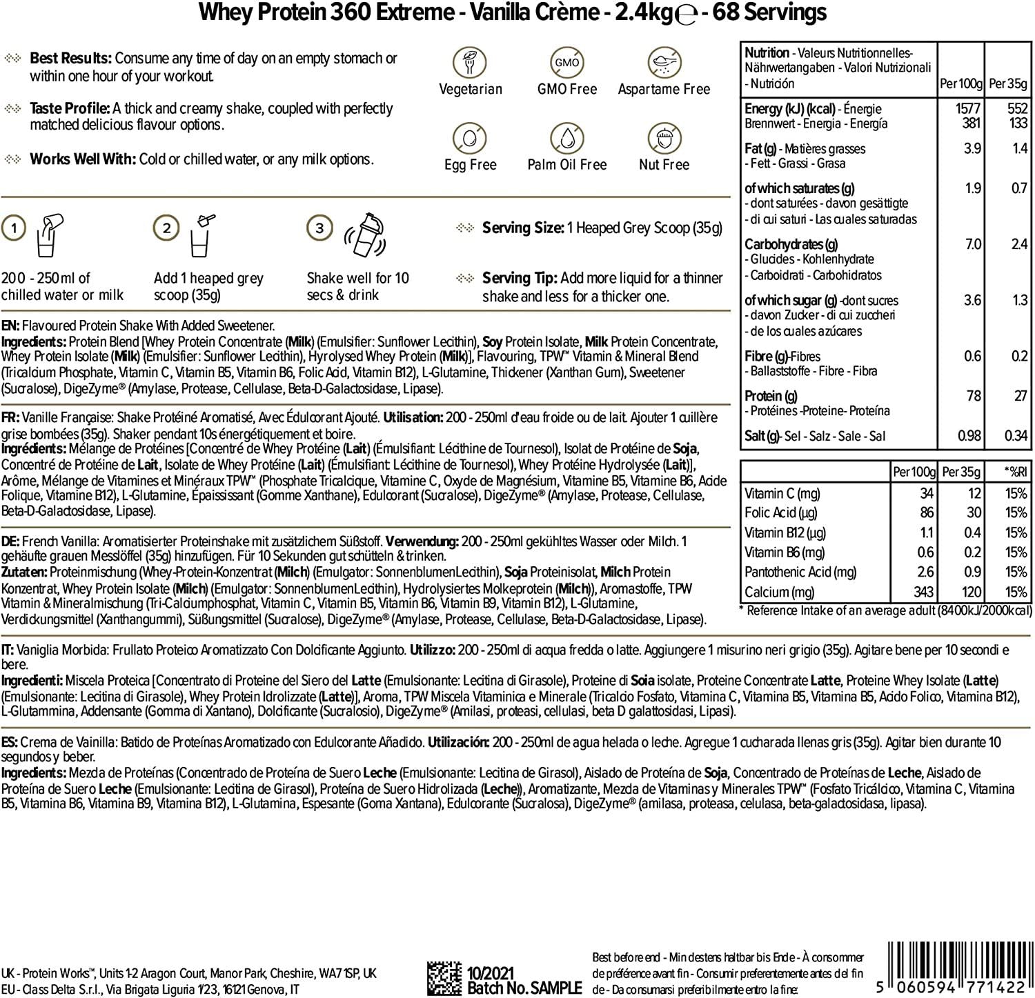 THE PROTEIN WORKS have engineered Whey Protein 360 Extreme with THE PROTEIN WORKS multi-phased protein system which includes THE PROTEIN WORKS very finest whey protein isolate and whey protein concentrate, resulting in a huge 23 g of protein per serving. It doesn t end there, THE PROTEIN WORKS have also added THE PROTEIN WORKS TPW Vitamin and Mineral Blend which consists of essential vitamins and minerals including, Vitamin D3, Calcium and Riboflavin. Whey Protein 360 also includes Digezyme to aid digestion and macronutrient absorption.