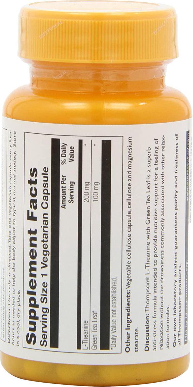 L-Theanine Maxicapsules Description: Thompson L-Theanine with Green Tea Leaf is a superb anti-stress formula intended to provide nutritive support for a feeling of relaxation without the drowsiness commonly associated with other relaxation formulas. Size: 30ct 200mg Directions: Use only as directed. Take one vegetarian capsulesule every four hours as needed to help the body adjust to typical, normal anxiety