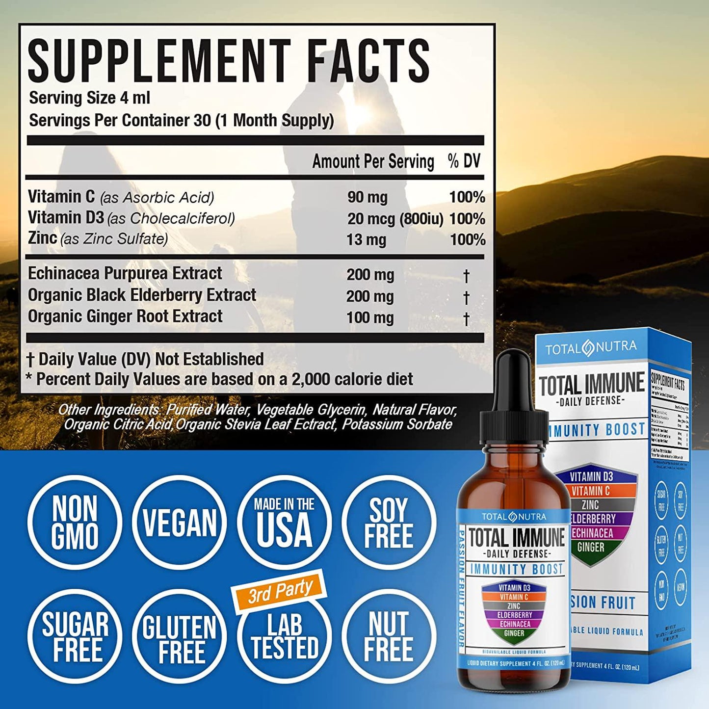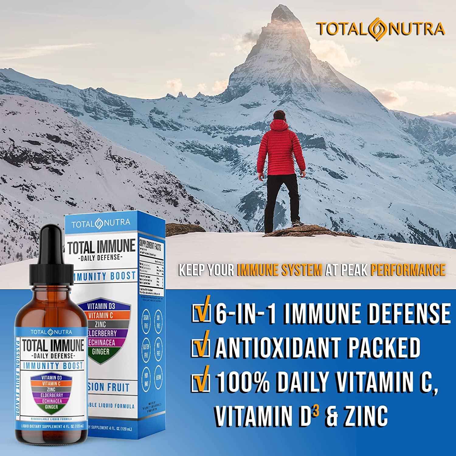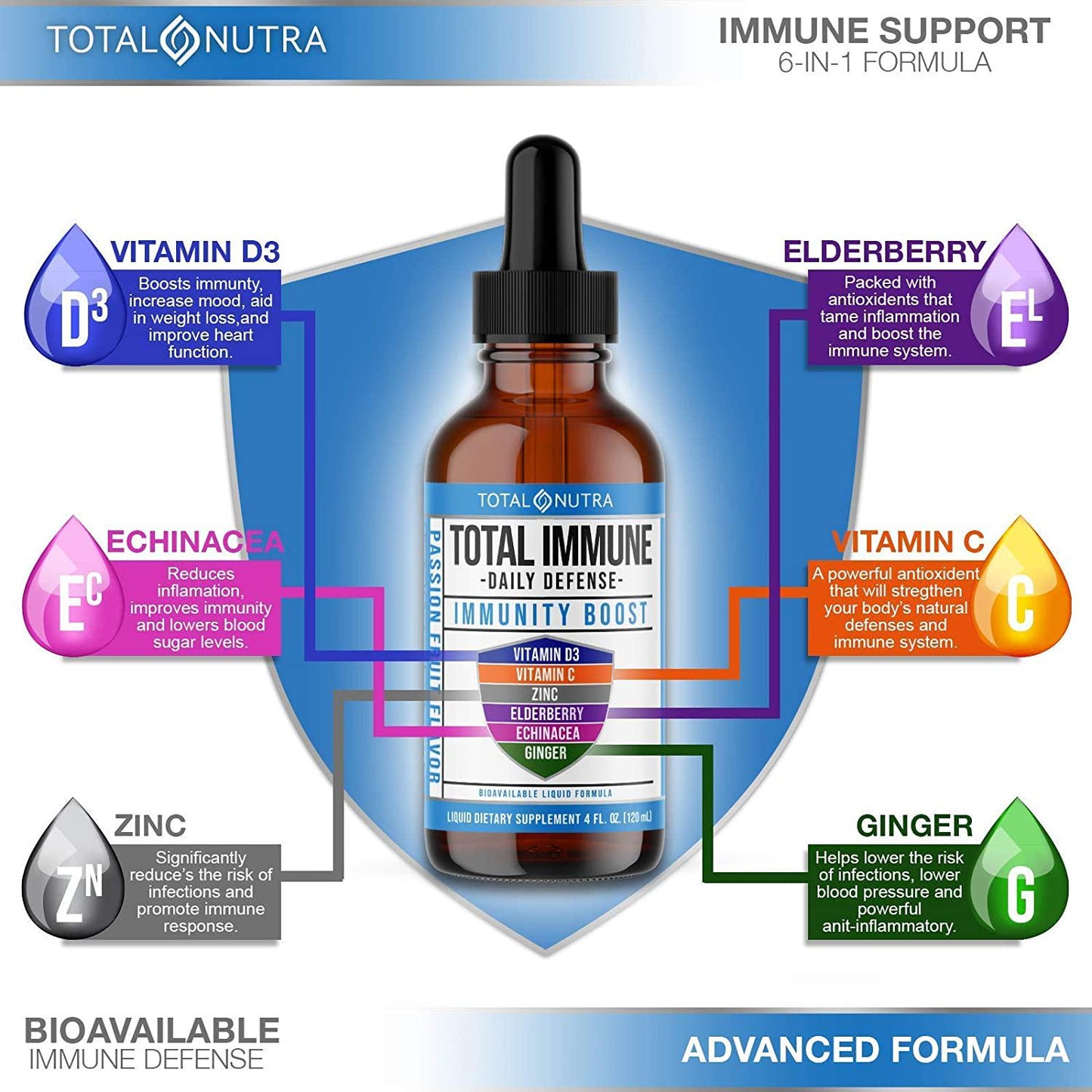 - POWER PACKED 6-IN-1 FORMULA - 100% Daily Dose of Vitamin C, Vitamin D and Zinc. Total Immune gives you extra Immune Support with 200mg Elderberry, 200mg Echinacea and 100mg Ginger. All in a Great Tasting Passion Fruit Flavor that the Whole Family can Enjoy. Total Nutra’s ingredients give you the Best Nature has to offer