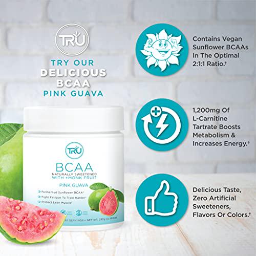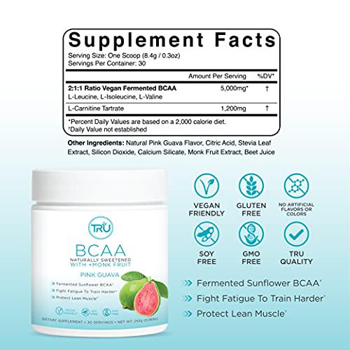 TRU BCAA Powder, Plant Based Branched Chain Amino Acids, Vegan Friendly, Zero Calories, No Artificial Sweeteners or Dyes, (30 Servings, Pink Guava)