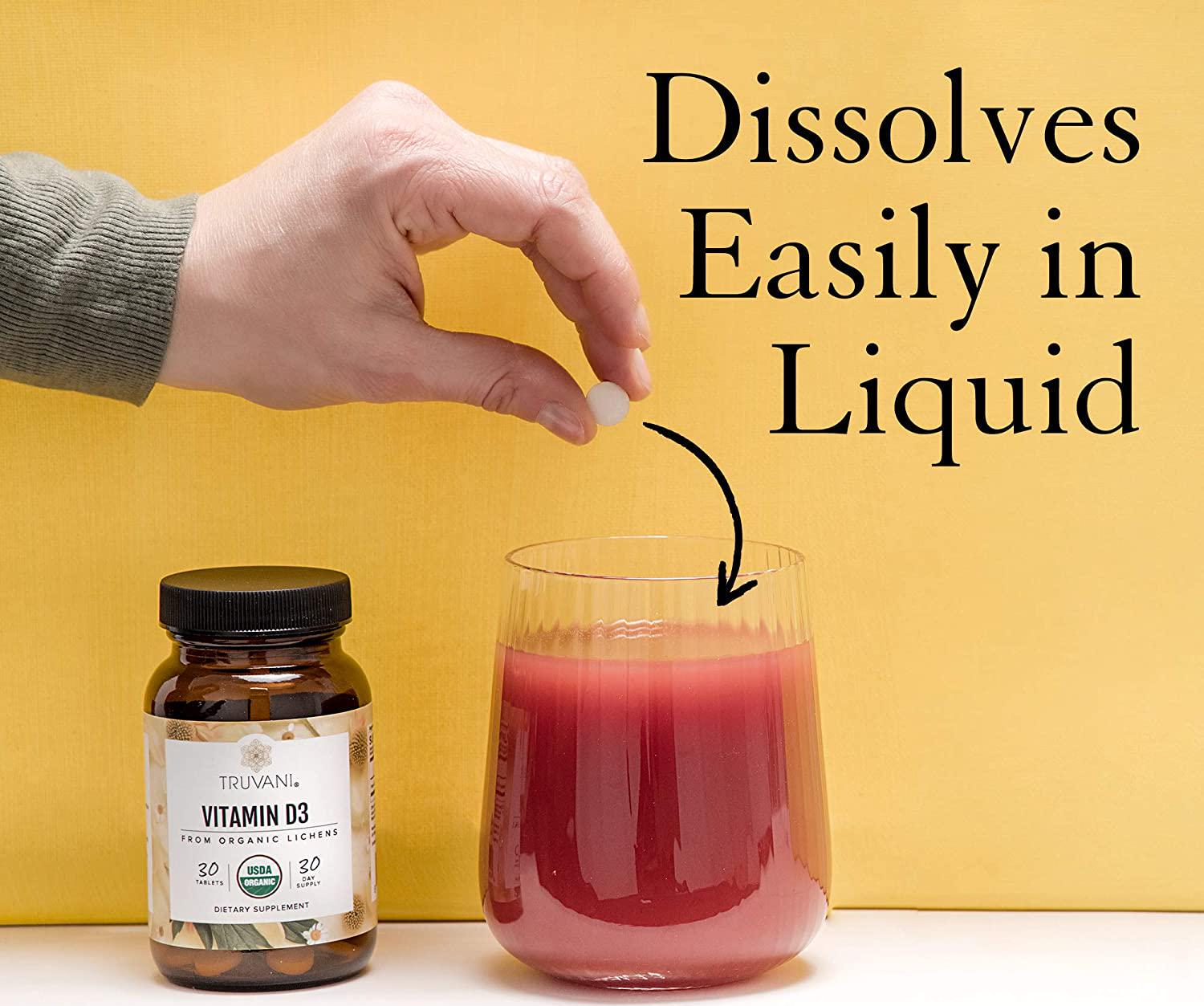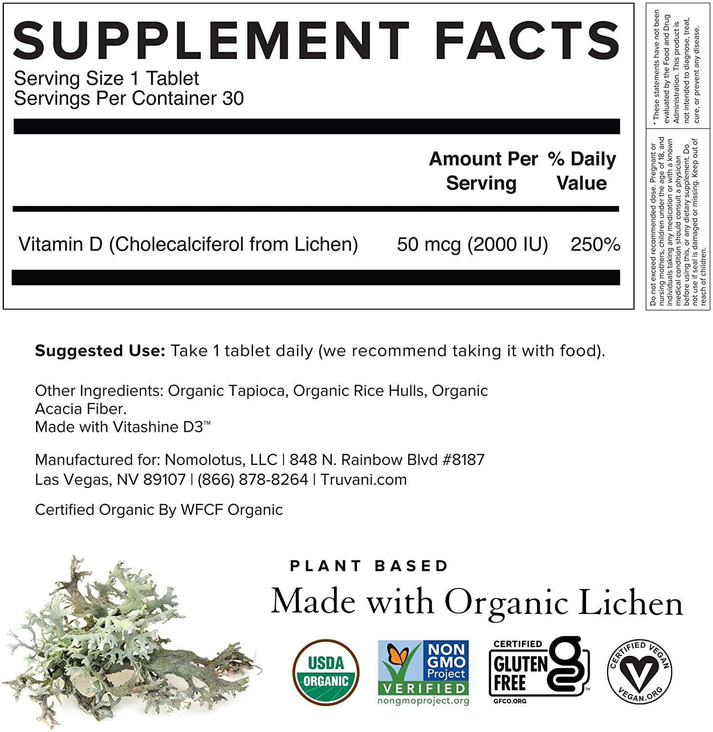 Truvani - Organic Vegan Vitamin D3 Tablets (2,000 IU) - USDA Organic Plant Based Vitamin D3 Supplement - Mood Enhancer and Immune System Support - Non GMO Gluten Free - 30 Tablets - 1 Month Supply