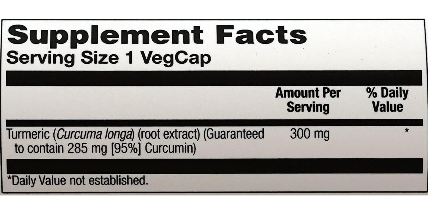 Supplement FactsServing Size: 1 VegCapAmount Per Serving% Daily Value***Turmeric (Curcuma longa) (root extract) (Guaranteed to contain 285 mg 95% Curcumin)300 mg*