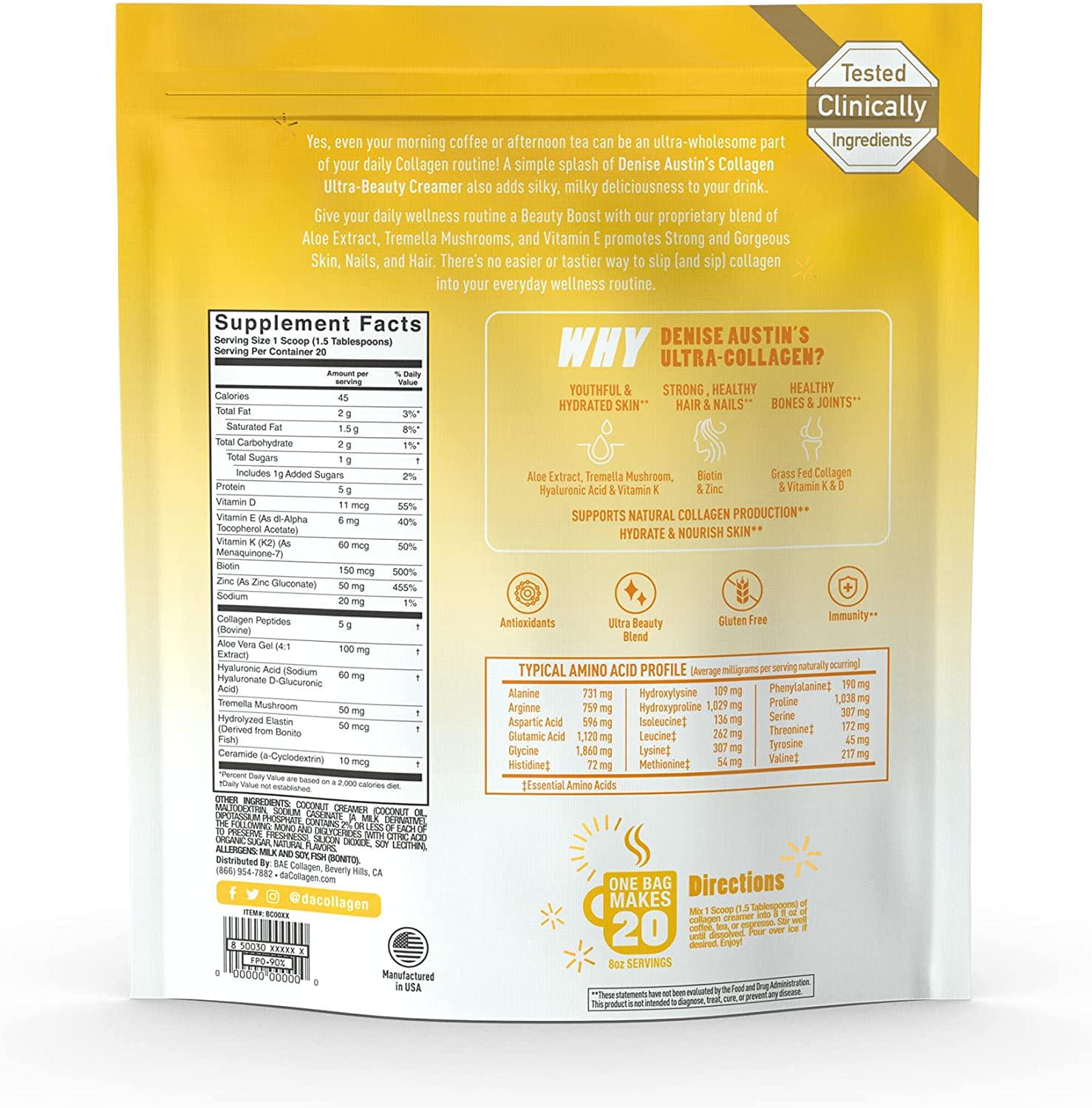 - ULTRA BEAUTY: Up your self-care game with Denise Austin Collagen Ultra-Beauty Boost Creamer. Specifically formulated to help women over 50 feel glorious from the inside-out while being versatile and easy to use. There’s no easier or tastier way to slip (and sip) collagen into your everyday wellness routine!