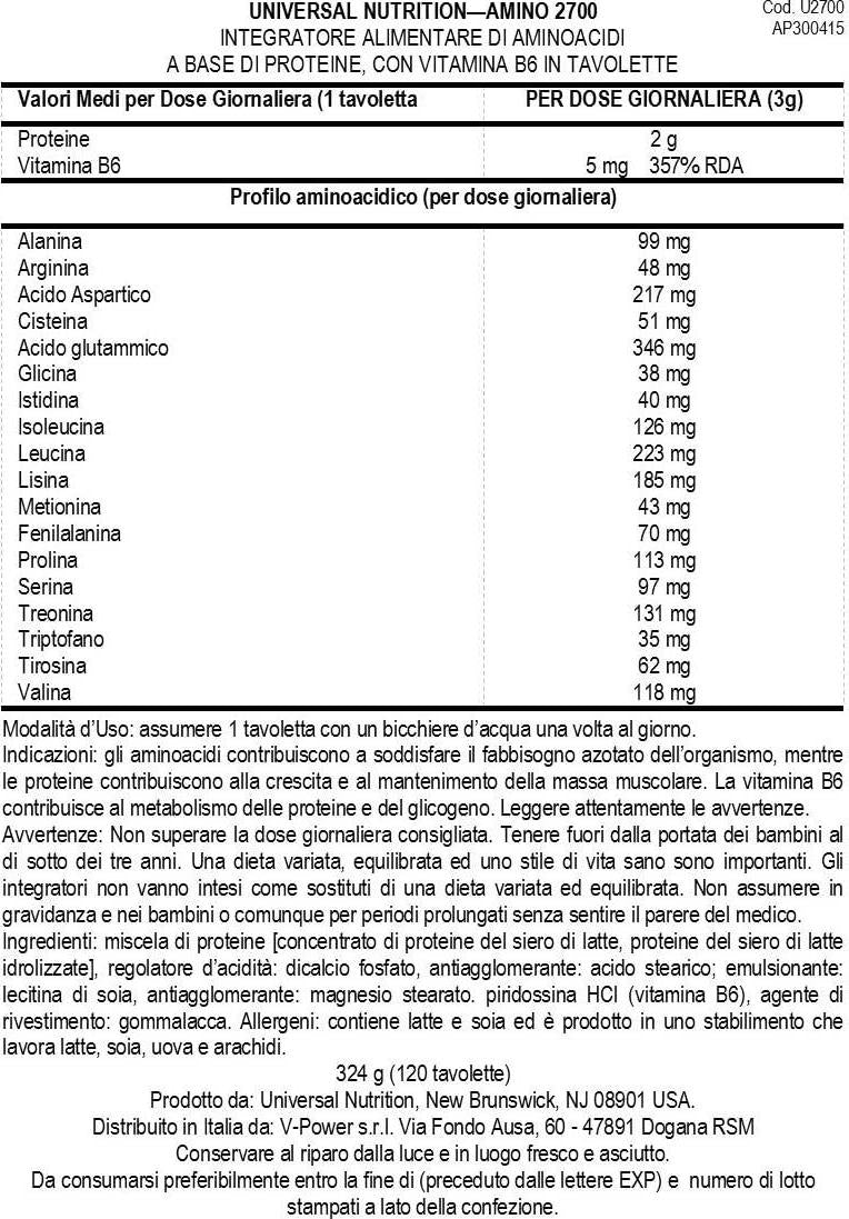 Universal’s amino 2700 is a high quality, sustained release amino acid formula packed with l-form and peptide bonded amino acids. Amino 2700 contains a full spectrum of essential, non-essential and conditionally essential amino acids. Our amino acids are derived from whey protein concentrate (wpc) and whey protein hydrolysate (wph) which allows for quicker assimilation into muscle tissue. Each tablet is packed with over 2,000mg of amino acids, and when taken prior to each meal, it becomes ideal for increasing overall amino intake throughout the day.