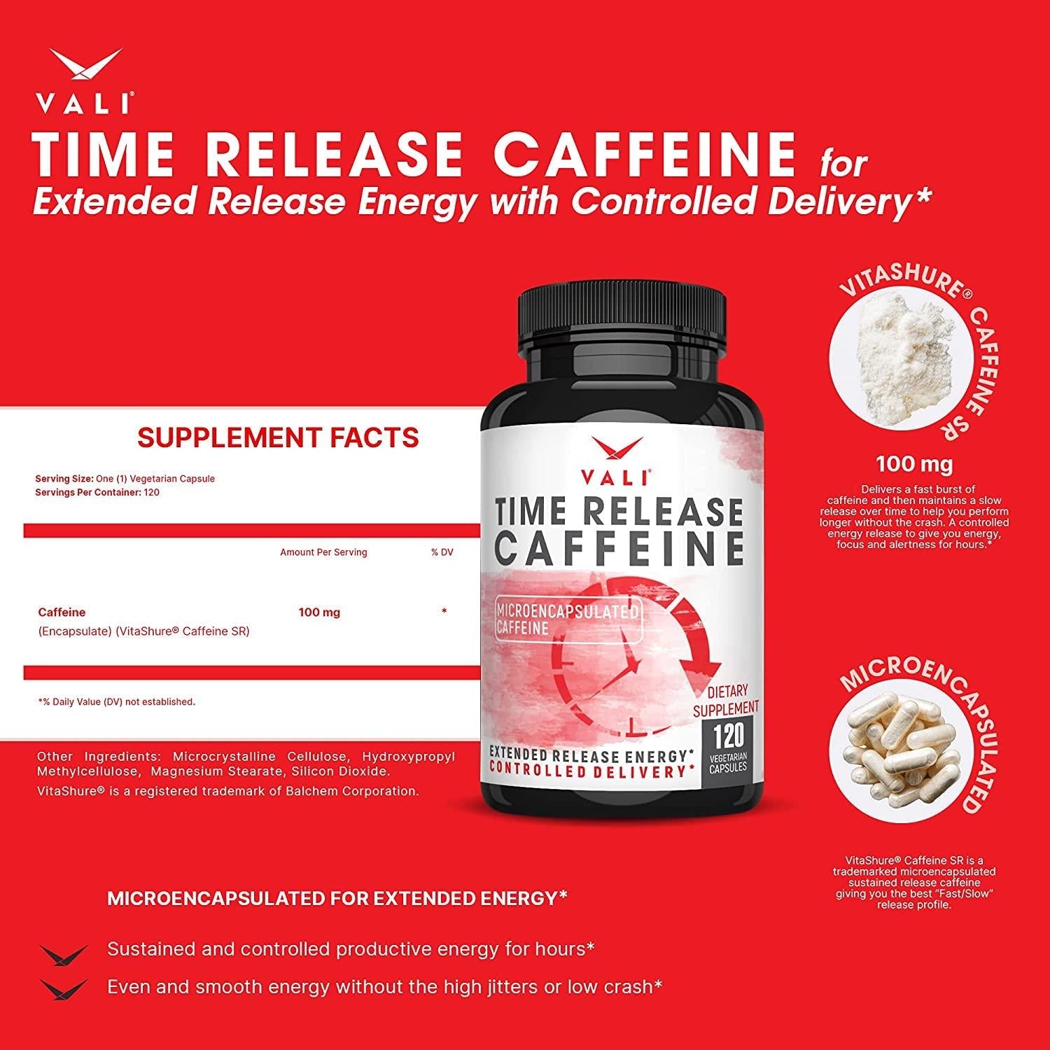 VALI Time Release Caffeine 100mg Pills - Smart Slow Release for Extended Energy and Focus. Advanced Nootropic Supplement. Brain Booster for Active Performance, Alertness and Clarity. 120 Veggie Capsules