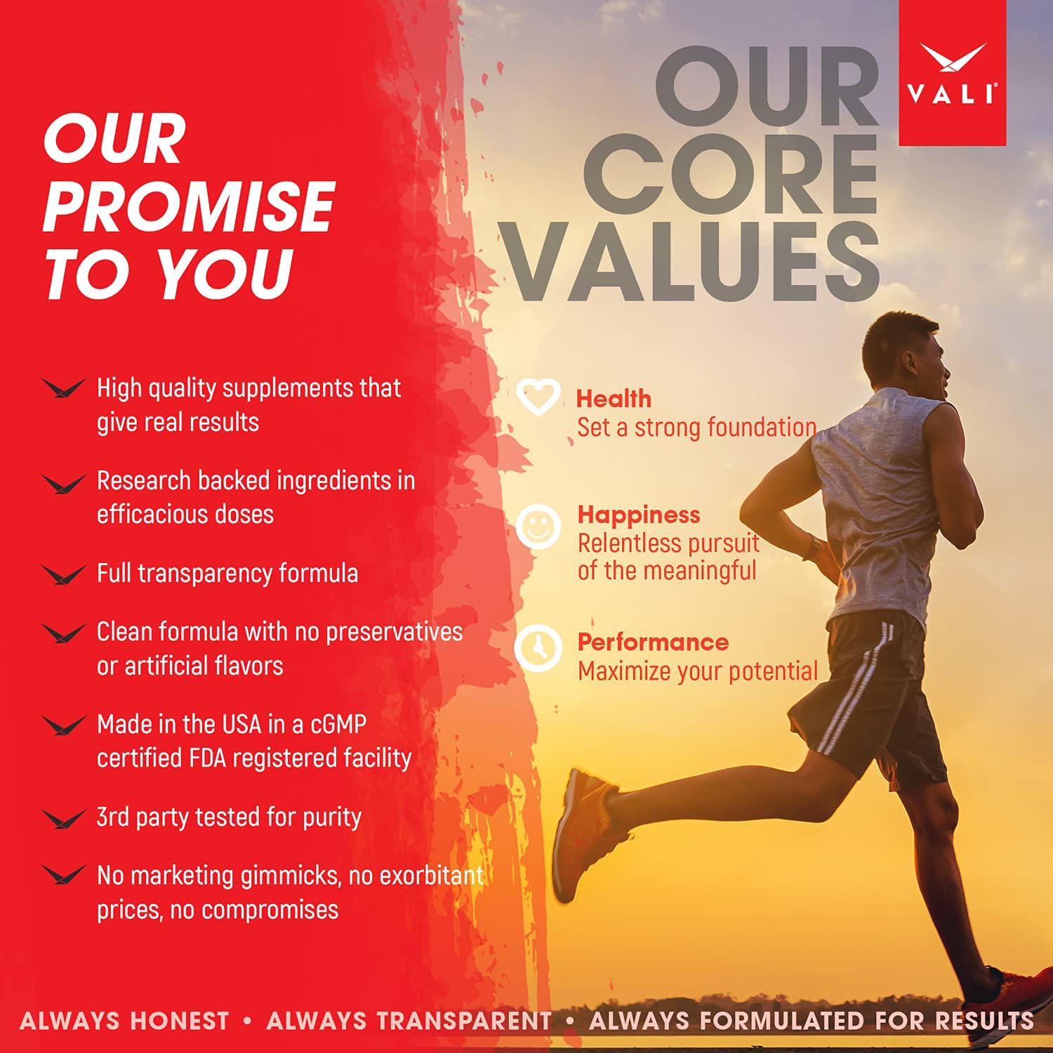 - Health, Happiness, & Performance - We started VALI because we want to know exactly what s inside our supplements and we want supplements that give real results without the marketing fluff other companies use to charge exorbitant prices. Nothing proprietary, clean highest quality ingredients at a great value, transparent formula, 3rd party testing for purity, and a commitment to above and beyond customer service. This is our promise to you! All our products come with a 100% money back guarantee.