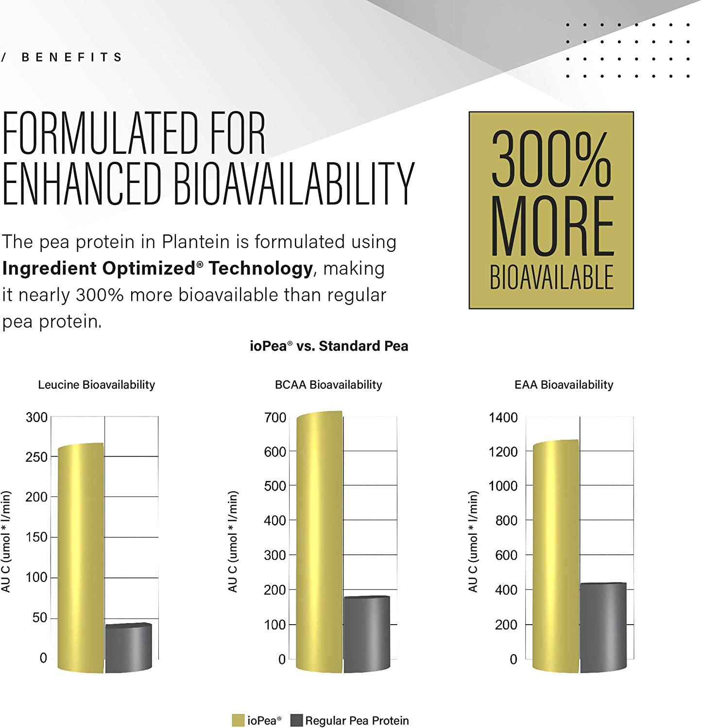 - VEGAN PROTEIN POWDER WITH 3X ENHANCED BIOAVAILABILITY: Easy on the stomach, the pea protein in Plantein is utilizes Ingredient Optimized Technology, which makes our pea protein isolate nearly 300% more bioavailable than regular pea protein.