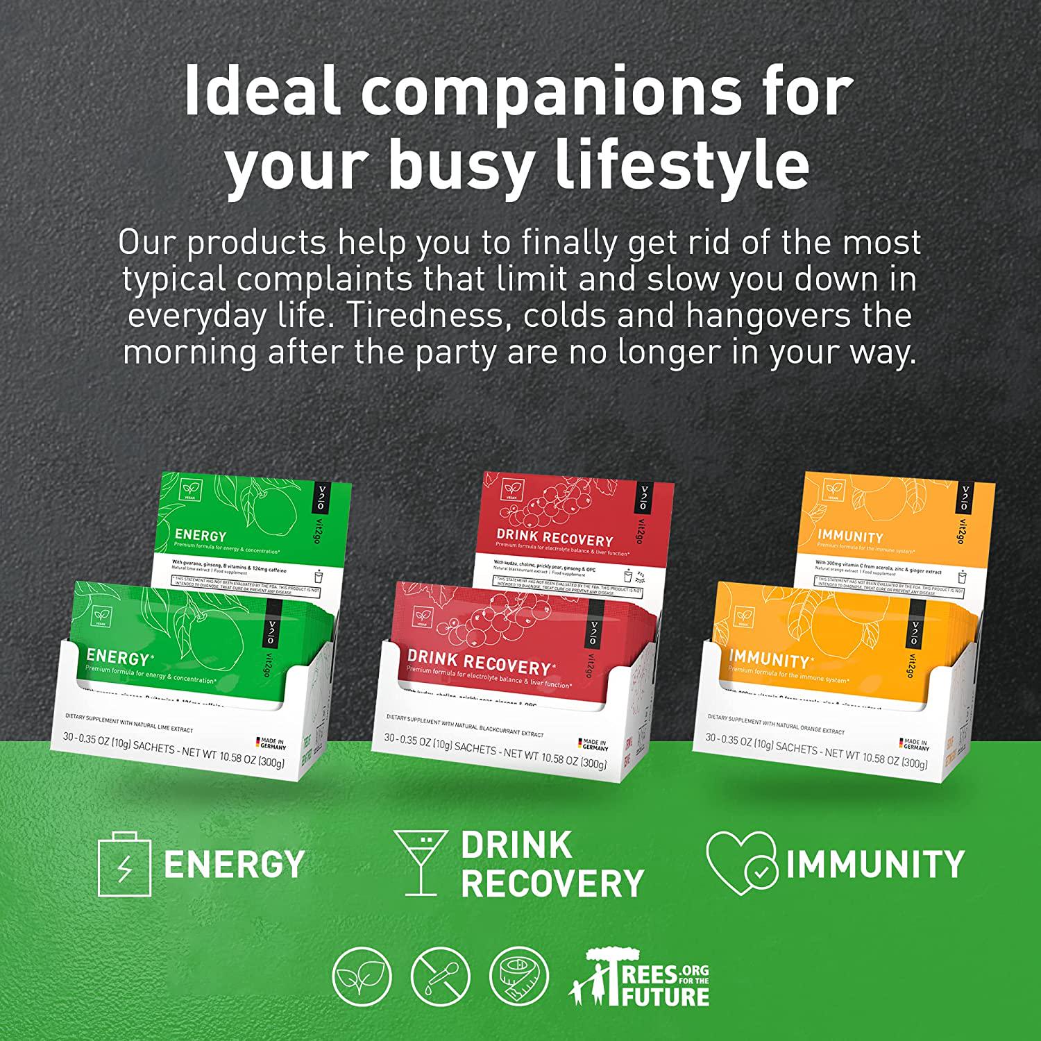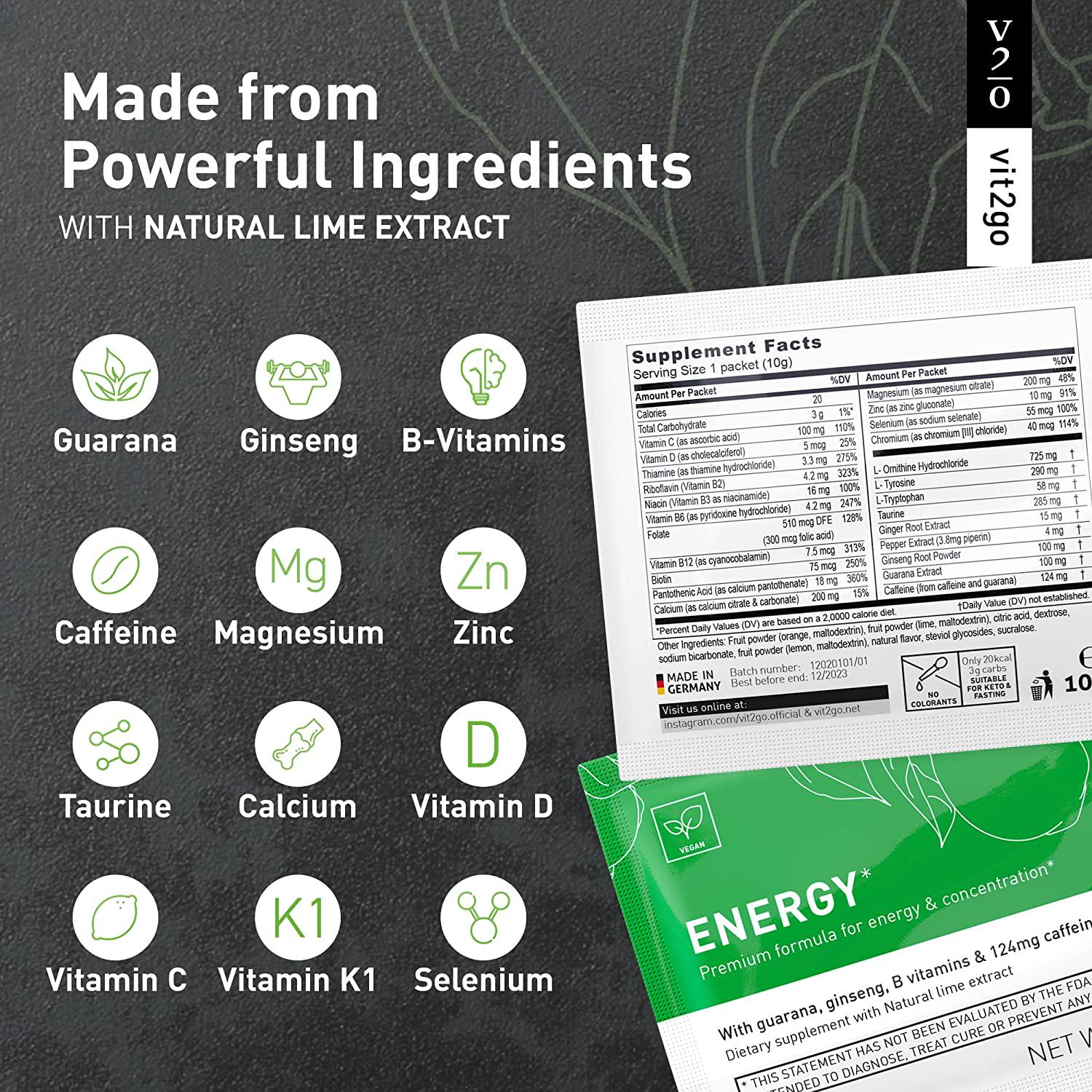 Vit2go Energy (10 Sachets) - Energy Drink Powder with Caffeine (124 mg), Guarana & Taurine, Perfect Energy Booster with Vitamins, Multivitamin, Vegan, Supplement, Made in Germany