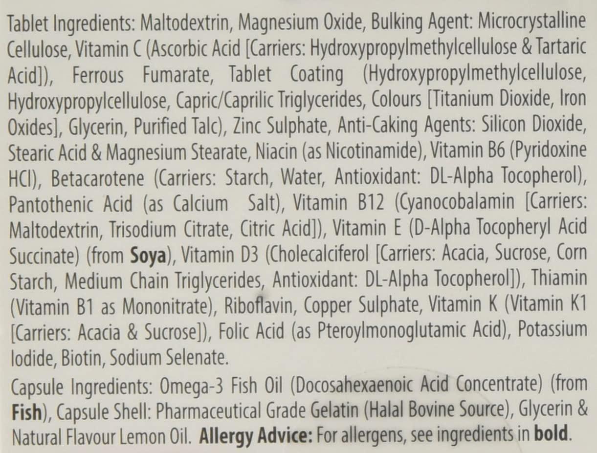 - Special Ingredients: Maltodextrin, Magnesium Oxide, Bulking Agent: Microcrystalline Cellulose, Vitamin C (Ascorbic Acid [Carriers: Hydroxypropylmethylcellulose & Tartaric Acid]), Ferrous Fumarate, Tablet Coating (Hydroxypropylmethylcellulose, Hydroxypropylcellulose, Capric/Caprilic Triglycerides, Colours [Titanium Dioxide, Iron Oxides], Glycerin, Purified Talc), Zinc Sulphate, Anti-Caking Agents: Silicon Dioxide, Stearic Acid & Magnesium Stearate, Niacin (as Nicotinamide), Vitamin B6 (PyridoxineHCl), Betacarotene (Carriers: Starch, Water, Antioxidant: DL-Alpha Tocopherol), Pantothenic Acid (as Calcium Salt), Vitamin B12 (Cyanocobalamin [Carriers: Maltodextrin, Trisodium Citrate, Citric Acid]), Vitamin E (D-Alpha Tocopheryl Acid Succinate) (from Soya), Vitamin D3 (Cholecalciferol [Carriers: Acacia, Sucrose, Corn Starch, Medium Chain Triglycerides, Antioxidant: DL-Alpha Tocopherol]), Thiamin (Vitamin B1 as Mononitrate), Riboflavin, Copper Sulphate, Folic Acid (as Pteroylmonoglutamic Acid), Potassium Iodide, Biotin, Sodium Selenate, Vitamin K (Vitamin K1 [Carriers: Acacia & Sucrose]). Allergy Advice: For allergens, see ingredients in bold See more