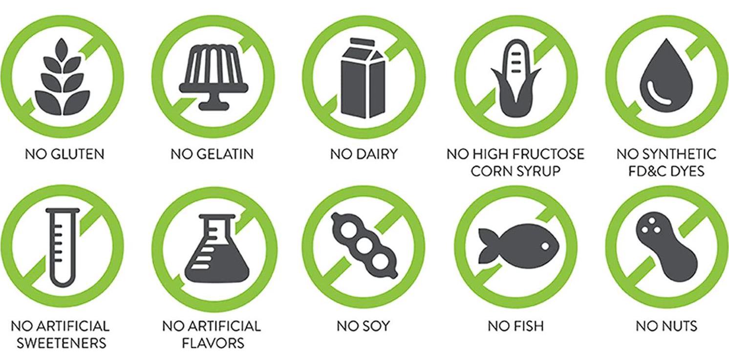 - Contains NO high-fructose corn syrup, NO artificial sweeteners, NO artificial flavors, NO FD&C dyes, NO dairy, NO nuts, NO soy, and NO gluten