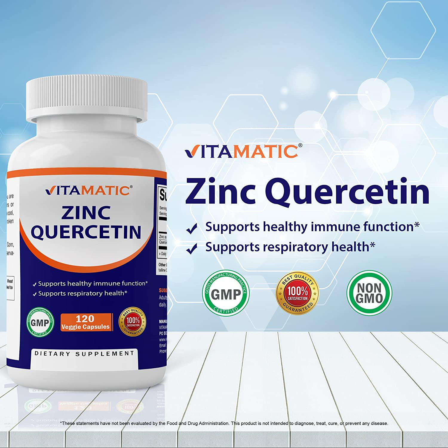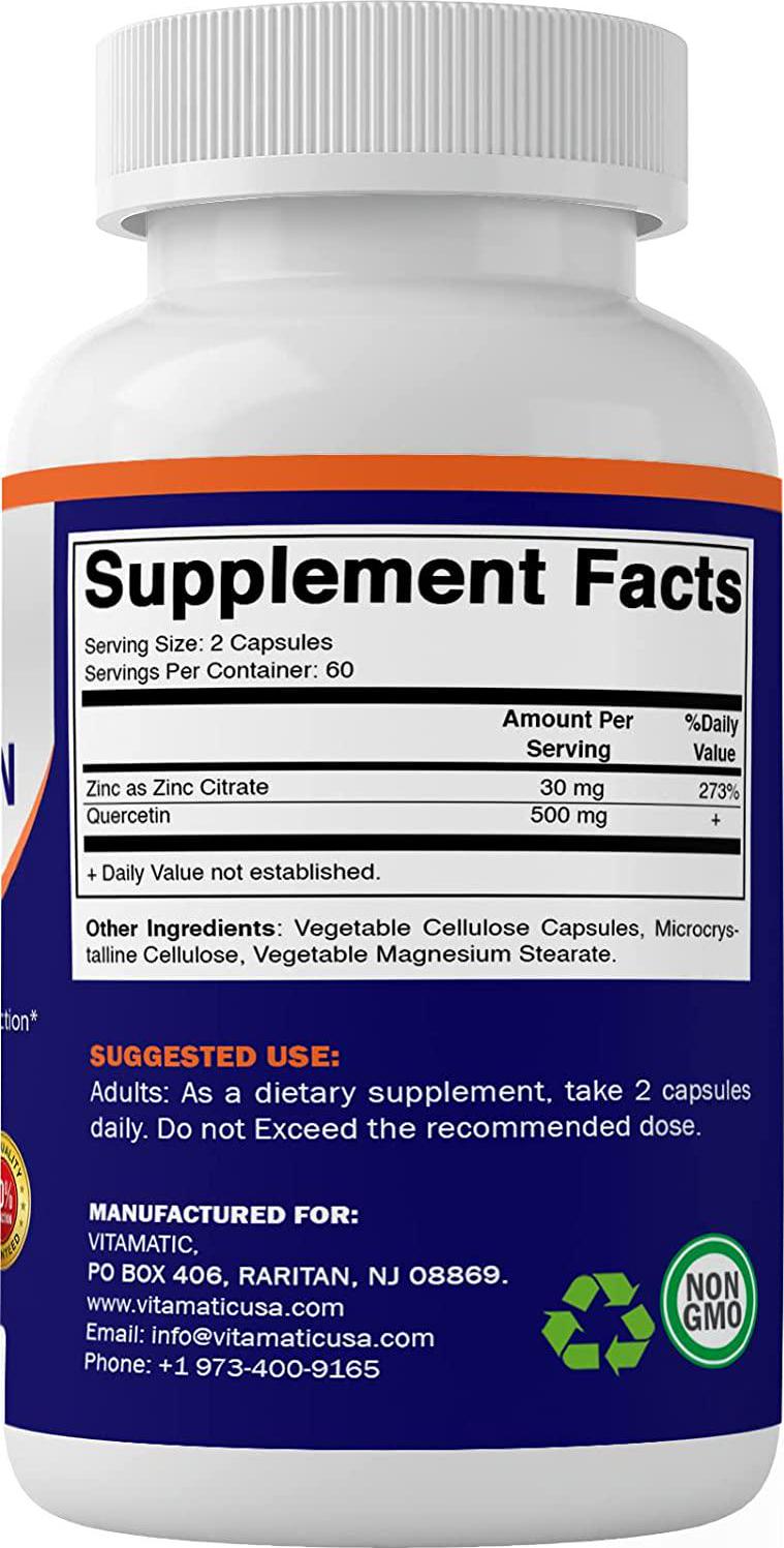 Vitamatic Zinc Quercetin - 120 Vegetarian Capsules - Zinc as Zinc Citrate 30mg and Quercetin Dihydrate 500 mg per serving - Immune Support