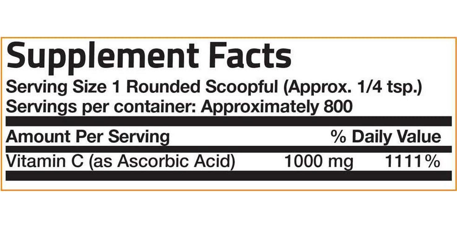 Protect your cells with Vitamin C every day!* Vitamin C is a water-soluble vitamin found in citrus fruits, green and leafy vegetables, tomatoes and cauliflower. In addition to the formation of collagen, vitamin C protects the body from potentially harmful free-radicals. Vitamin C is also effective in helping to maintain a healthy immune system. The body cannot make or store vitamin C, so it must be replaced every day. HIGHEST QUALITY FORMULA: Our Vitamin C was formulated and recommended by the greatest Vitamin C minds. We use only the best ingredients available. Manufactured at FDA cGMP certified facility TOP POTENCY: The most effective Vitamin C Powder on the market. 50+ year track record of proven results. VITAMIN C WORKS: Famous doctors rave about Vitamin C for a reason. HIGHLY REGARDED AND RECOGNIZED: Our Products Have Been Consistently Recommended By The Foremost Nutritional Scientists Like Nobel Prize Winner, Dr. Linus Pauling WORKS OR YOUR MONEY BACK: We back our products up with a 365-day hassle-free money back guarantee. There's no risk when you order now! If you aren't completely satisfied, simply contact us and we'll give you a full refund, no questions asked. Our #1 priority is to make sure our customers are completely happy. BRAND YOU CAN TRUST: Since 1960, Bronson has been providing families with the highest quality products and finest customer service available. This 50+ year heritage speaks for itself. But with so many online vitamin stores, why should you purchase supplements from Bronson In short, our company is time proven, offering the purest, high quality vitamins backed by science. * These statements have not been evaluated by the Food and Drug Administration. This product is not intended to diagnose, treat, cure or prevent any disease.