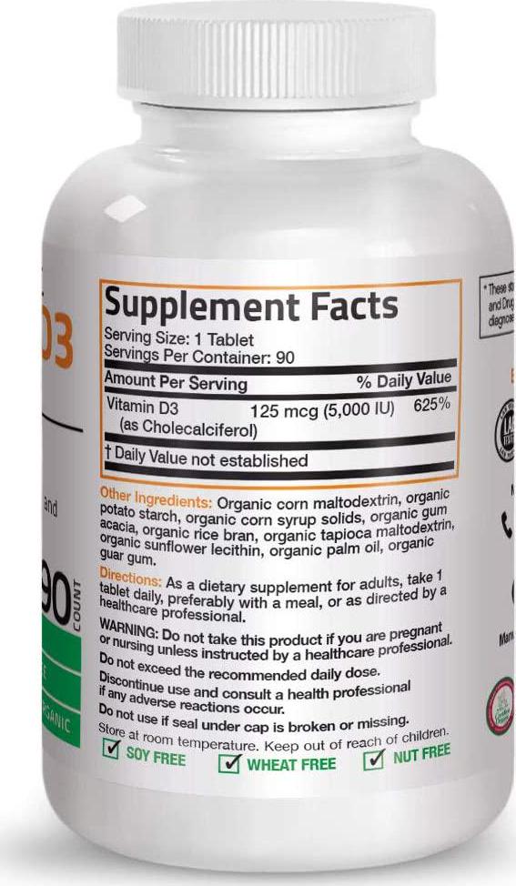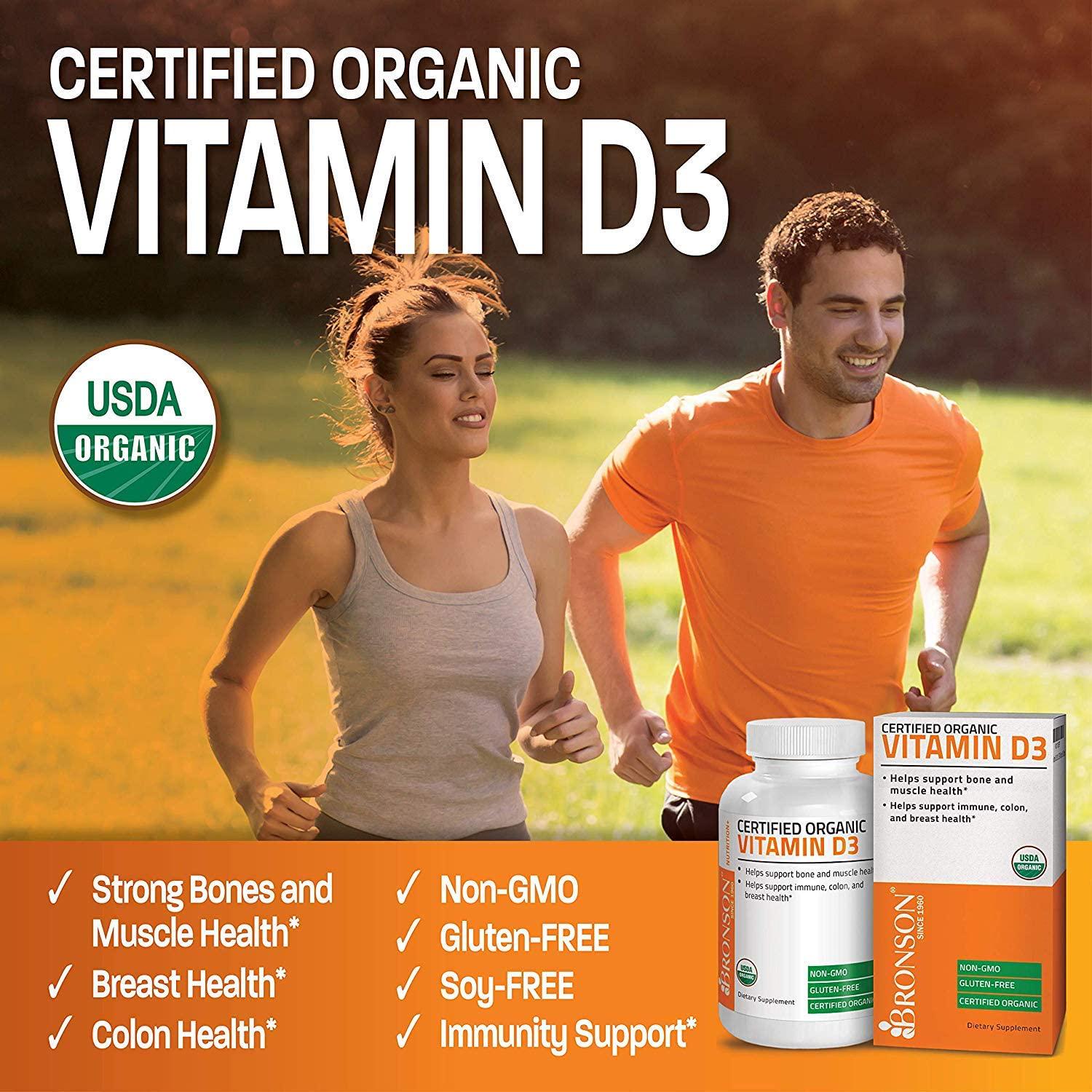 USDA Certified Organic Vitamin D3 - An Excellent Way to Help Replenish Vitamin D Levels. Vitamin D is a fat-soluble nutrient that is produced through skin exposure to sunlight, which triggers vitamin D synthesis. Despite the importance of the sun to vitamin D synthesis, many experts agree it is wise to limit sun exposure to the skin, which often results in lower than ideal Vitamin D levels in the body. Vitamin D supplements are another option for helping to replenish vitamin D status. Each tablet of Bronson Organic Vitamin D supplies 5000 IU of Vitamin D3, the preferred form. Research has shown that Vitamin D supports bone, immune, colon, muscle, and breast health.* Vitamin D supplements are an excellent way to help replenish vitamin D levels. * These statements have not been evaluated by the Food and Drug Administration. This product is not intended to diagnose, treat, cure or prevent any disease.