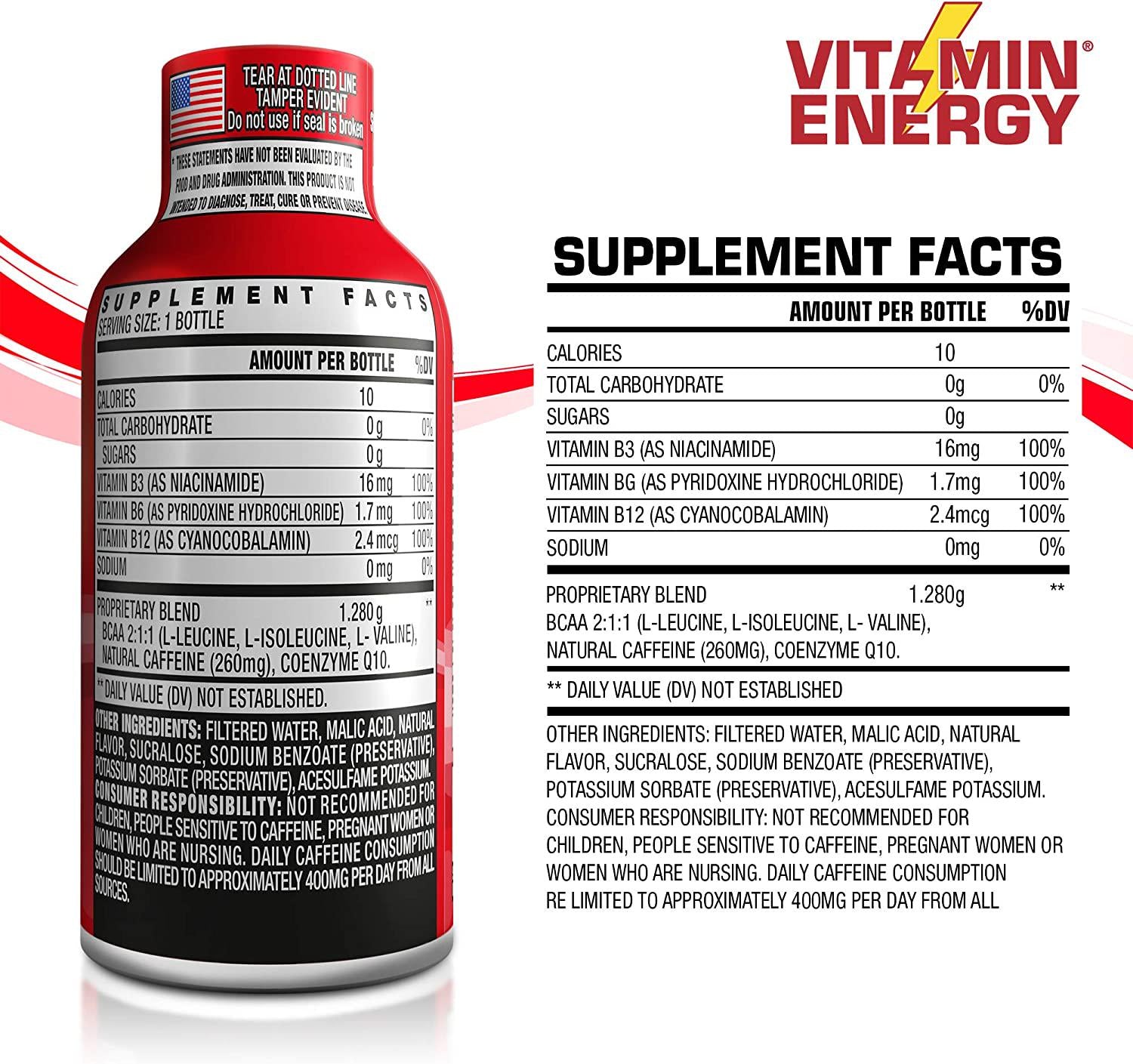 - Powerful energy boost: At only 2 oz per bottle, Vitamin Energy shots are a convenient source of vitamins that boost energy and focus for up to 7+ hours; each low-calorie shot contains 260mg of natural caffeine with zero sugar and zero carbs