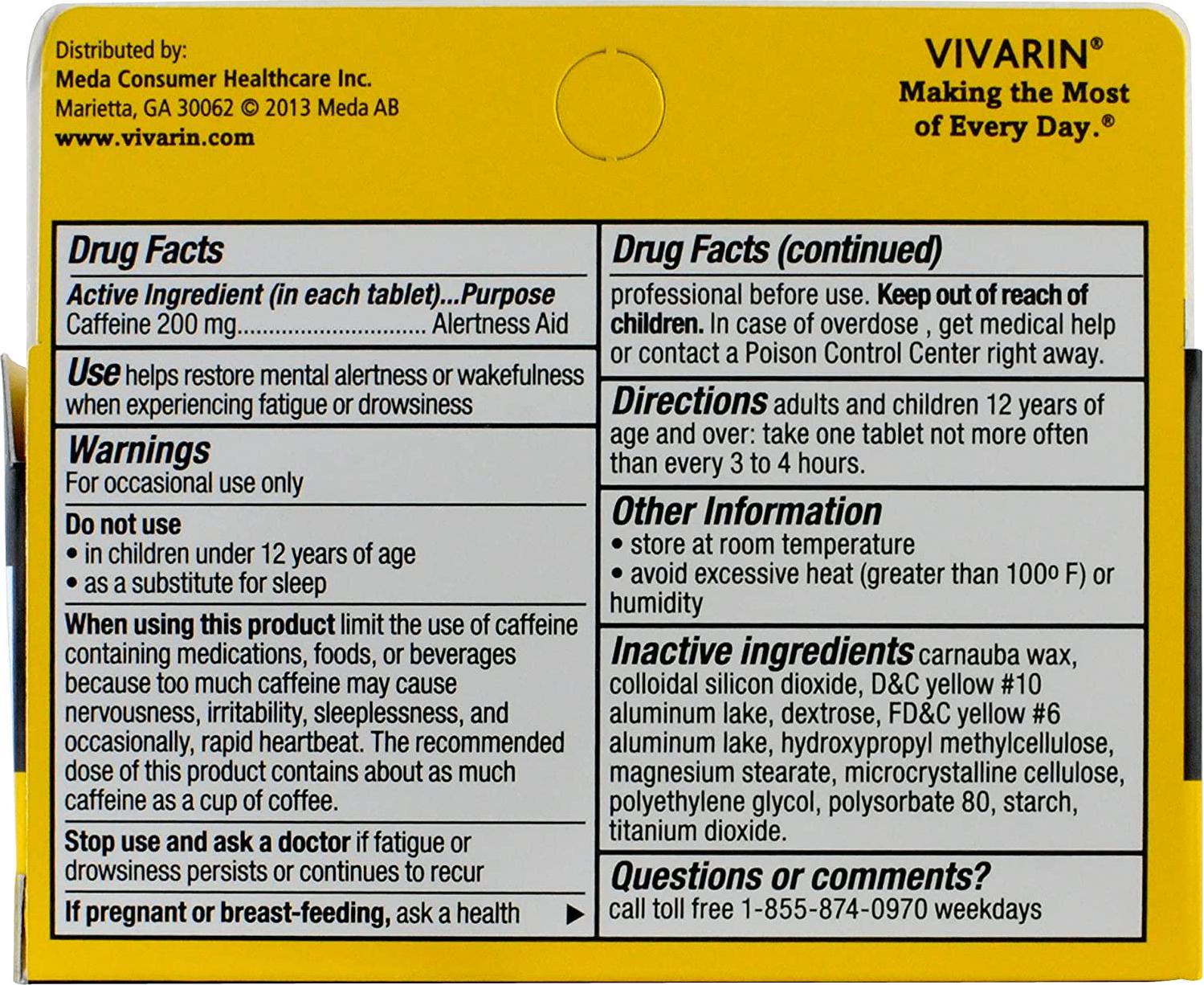 Vivarin Caffeine Alertness Aid Tablets help you stay awake and alert when you need it most. Vivarin tablets are safe and effective Functional Caffeine. Use 200mg Vivarin Caffeine tablets to help restore mental alertness or wakefulness when experiencing occasional drowsiness. Great for when traveling, during long business hours, studying for college exams, or when general drowsiness occurs and limits your ability to stay alert. Each tablet provides 200mg of caffeine, about as much as a cup of coffee but in a fast and convenient tablet. Take Vivarin Caffeine tablets with you when you need mental energy to power your day. Limit your use of caffeine in medications, foods, and drinks while taking Vivarin tablets because too much caffeine may cause nervousness, irritability, sleeplessness, and occasionally, rapid heartbeat. For occasional use only. Not a substitute for sleep. If drowsiness persists, consult a doctor. Not for children under 12.