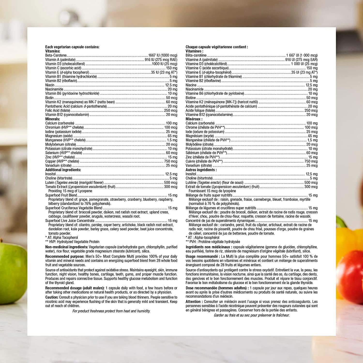 Mens 50+ Most Complete Multi is an iron-free one-per-day formula providing 100% of recommended vitamins and minerals in a whole-food base to support bone and eye health, energy and immune function for men over 50.