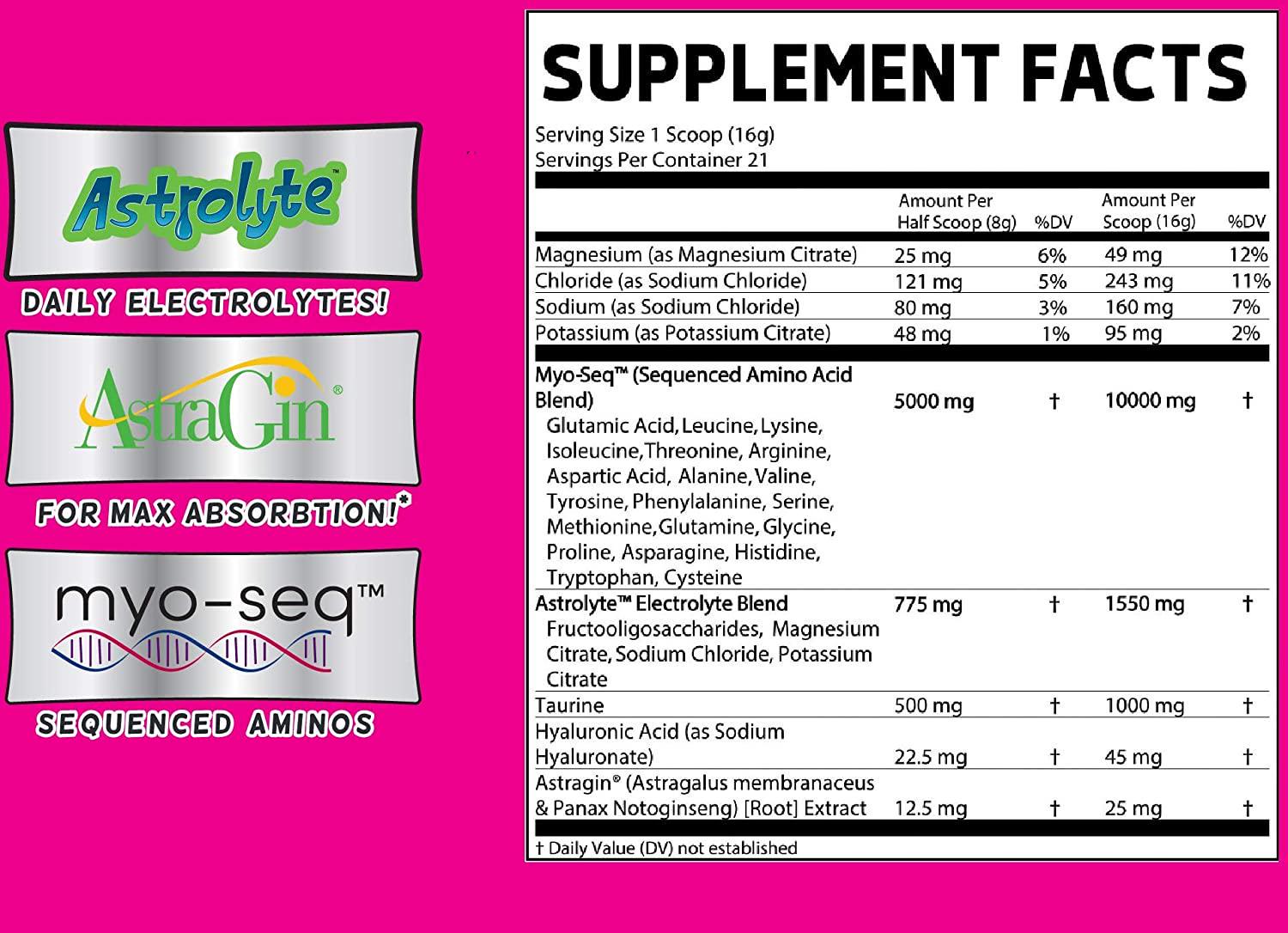 - ESSENTIAL SEQUENCED AMINO ACIDS: A huge 10 grams of BCAAs & EAAs Leucine, Isoleucine, Valine, Glutamine and more plus the Hydrating Astrolyte Electrolyte Blend with Magnesiem, Sodium Chloride & Potassium and Added Joint Support too with Hyaluronic Acid.