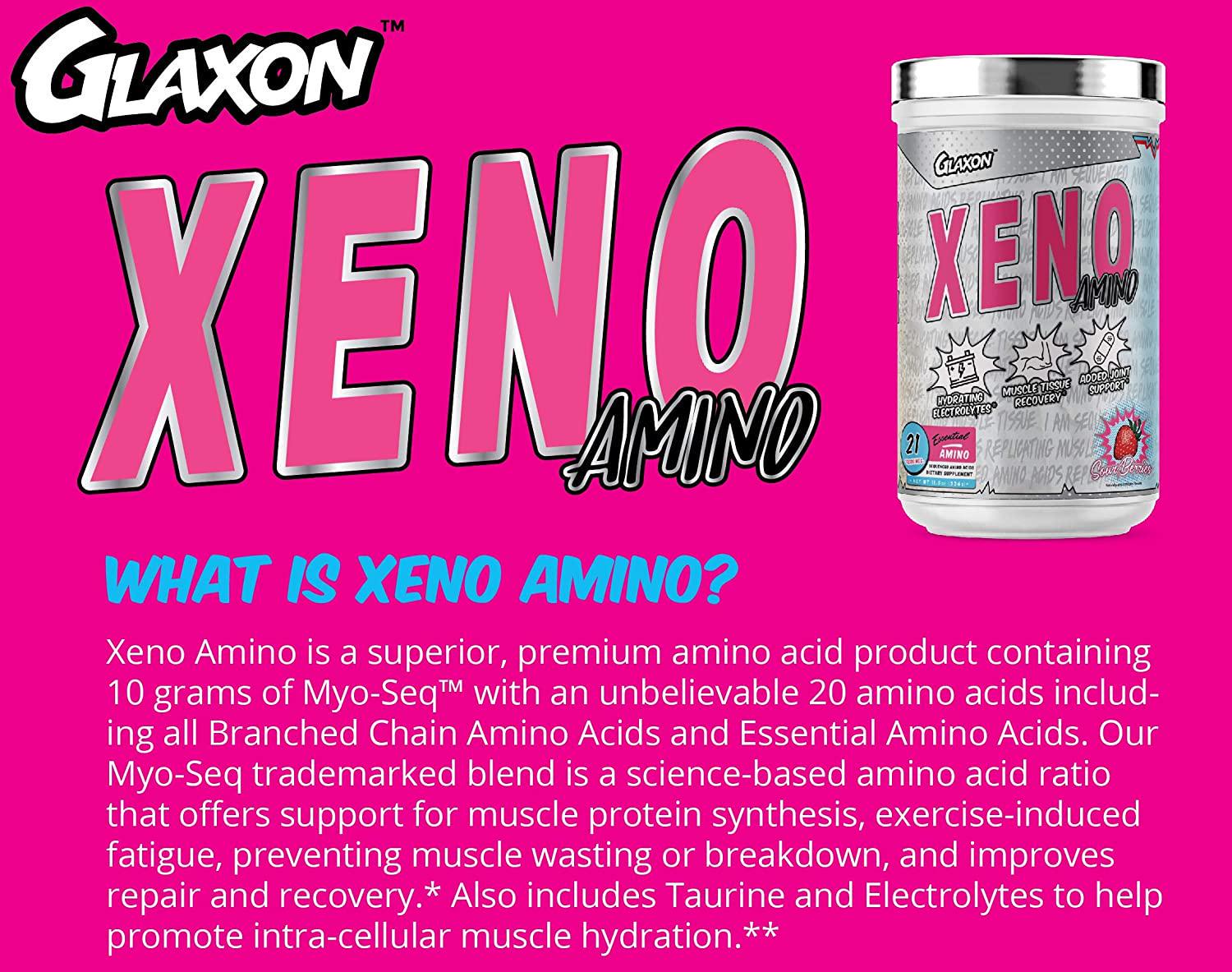 Maximize Muscle Growth and Recovery! Do you feel youre not making the gains you expect from the effort you put in at the gym? It may be a matter of not fully recovering from your workouts before getting back after it. While your enthusiasm to get back into the gym is admirable, we need to slightly pump the brakes and make sure youre recovering properly. To build mounds of muscle, you need to tear down the muscle fibers so that they can be rebuilt to come back bigger and stronger. A limiting factor when attempting to build quality lean muscle tissue is your recovery. If you hit the muscle again in the gym before its properly recovered, youre essentially taking one step forward and two backward. Amino acids are crucial to your recovery as they are the building blocks of muscle and were not just talking about BCAAs. Research has shown that while BCAAs are useful, results are maximized by including all 9 essential amino acids (EAAs). Thats where Glaxon Xeno Amino shines. Glaxon Xeno Amino is specifically formulated to enhance muscle recovery, aid in staying anabolic, and help add the lean muscle mass youve been looking for. It doesnt stop there, Xeno Amino is also the perfect addition to any weight loss program as it can effectively help preserve lean muscle mass while in a caloric deficit.